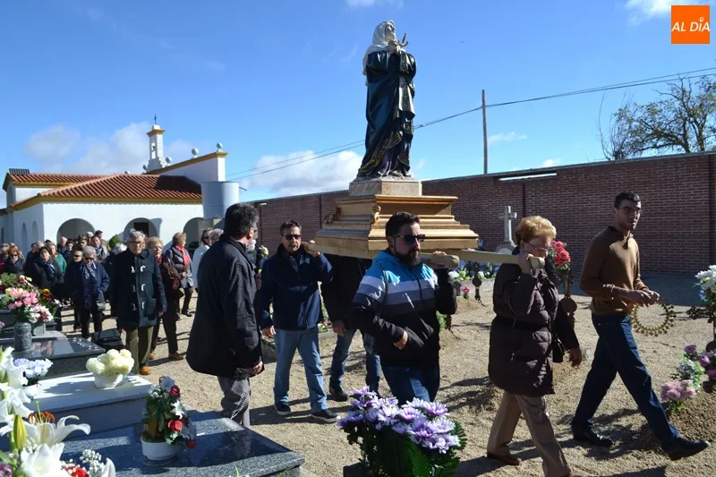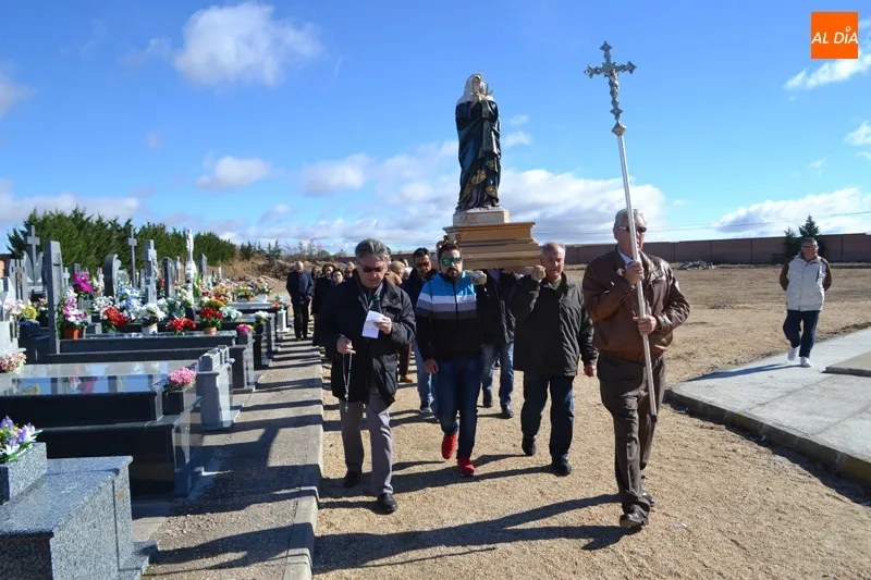 cofradías y fieles arroparon a la imagen de la Virgen que, portada a hombros, recorría el camposanto realizando el rezo entre un respetuoso silencio, como paso previo a la solemne eucaristía, celebrada en el mismo recinto, y oficiada por el párroco local Lauren Sevillano.