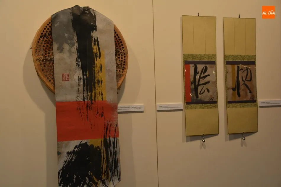 Otro de los atractivos de la muestra son los materiales que combina este creador: ?Esto está pintado sobre pizarra, la pizarra es difícil de transportar pero he encontrado una máquina en León que la corta como si fuera papel. Utilizo pizarra con tela asfáltica como lienzo y también objetos que la gente del campo ya no usa y arrincona. Cosas que encuentro cerca del pueblo de mi mujer donde tengo el estudio y que voy utilizando, como esta acedera de piel de vacuno que servía para cribar, porque pienso que el ascenso al paraíso también tiene algo de criba? hay que cribar la materia hasta dejar la esencia?.