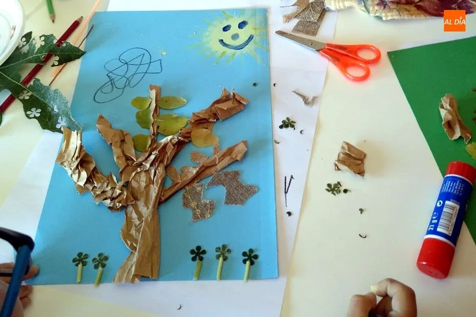 Siguiendo las instrucciones de las monitoras del Torreón, Fátima del Arco y Mari Carmen Luis, los pequeños utilizaron restos vegetales y hojas de árboles arribeños como el almez y el zumaque, además de la higuera, para crear árboles, que han pegado sobre cartulina. Además, han aplicado distintas técnicas de pintura, como el puntillismo, tizas y garabatos para crear dibujos, flores, el sol, mariposas y pájaros, que completaron sus cuadros, pequeñas obras de arte, donde cada niño ha plasmado también su creatividad.
