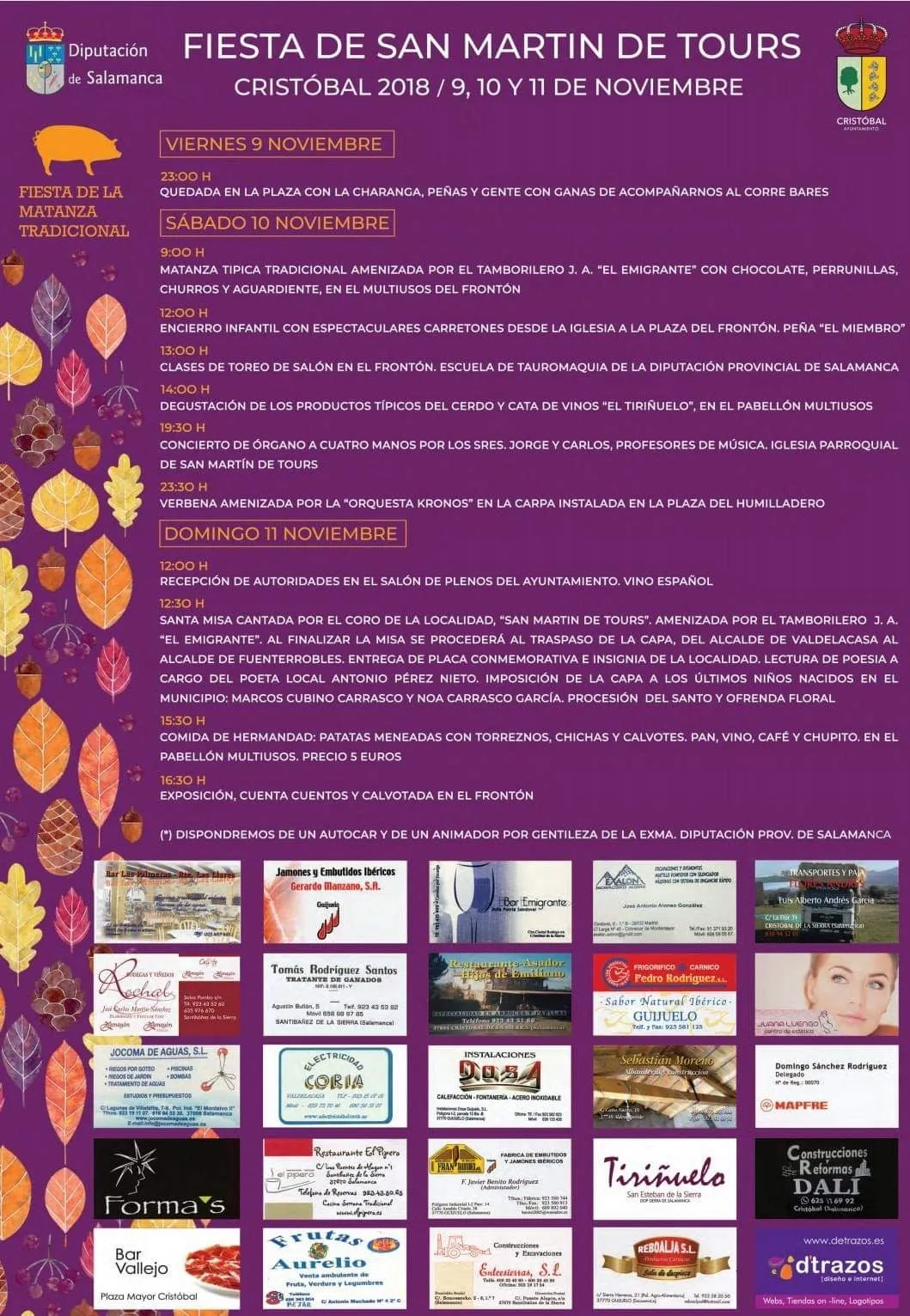 El viernes se comenzará con el tradicional correbares con las peñas del municipio y una animada charanga. Ya el sábado, será el turno de matanza típica a primera hora de la mañana, seguida de un encierro infantil desde la iglesia y clases de toreo de salón en el frónton a cargo de la Escuela de Tauromaquia de Salamanca. Tras una degustación de productos del cerdo, será el turno de un concierto de órgano a cargo de los profesores de música Jorge y Carlos en la iglesia parroquial.