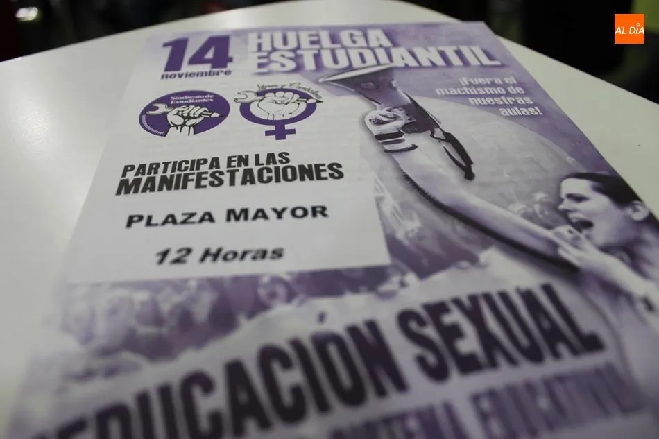 Llamamiento del Sindicato de Estudiantes y la plataforma feminista Libres y Combativas, y a los que se se suman los Yay@Gaitas Salamanca y la Coordinadora Estatal por la Defensa del Sistema Público de Pensiones, para secundar la huelga estudiantil convocada el próximo miércoles día 14 de noviembre en todos los institutos de Educación Secundaria y universidades de España. Una convocatoria en la que además de pedir la derogación de la LOMCE y la reversión de todos los recortes educativos, quieren hacer especial hincapié en ?el machismo en las aulas?, para lo que exigen al nuevo Gobierno de Pedro Sánchez ?la puesta en marcha inmediata de una asignatura de educación sexual inclusiva evaluable y obligatoria en todos los centros educativos?, considerando la educación como una herramienta esencial para concienciar sobre la igualdad real y efectiva.