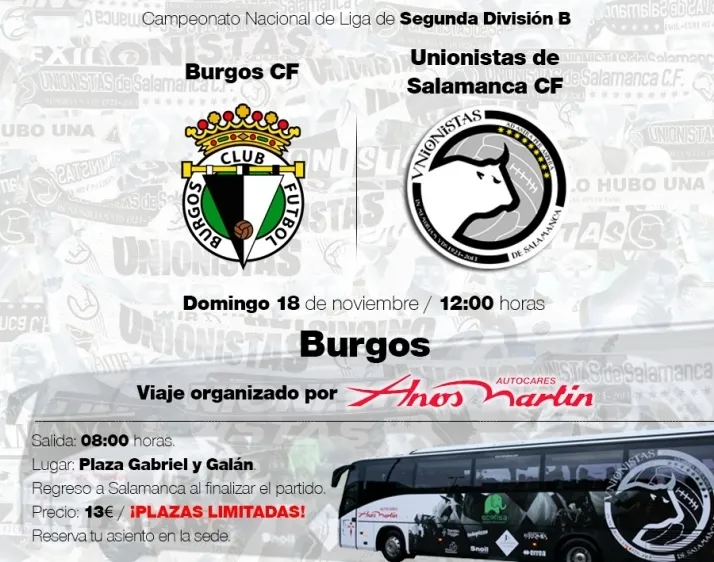 La afición de Unionistas de Salamanca CF podrá desplazarse hasta Burgos para presenciar el choque correspondiente a la 13ª jornada del grupo I de Segunda División B en la que Unionistas de Salamanca CF se medirá al Burgos CF. El partido se disputará el próximo domingo 18 de noviembre a partir de las 12:00 horas. La salida será a las 08:00 horas.