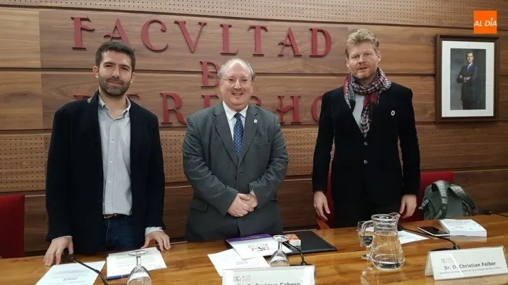 La Facultad de Derecho ha sido escenario de la firma del convenio de colaboración entre la Universidad de Salamanca y la Asociación Federal Española para el Fomento de la Economía del Bien Común para la creación de una red interuniversitaria de estudios del bien común, que será coordinada por Nuria del Álamo, profesora de la USAL, y Rafael Morales, profesor de la Universidad Pablo Olavide. Un convenio que es un ?punto de partida? para enfocar la investigación y la enseñanza hacia la economía del bien común, manifestó Christian Felber, iniciador del Movimiento de la Economía del Bien Común y del proyecto ?Banco para el Bien Común? en Austria. Un convenio en el que además de la universidad salmantina, participan Sevilla y Valencia, que ya cuenta con la primera cátedra.