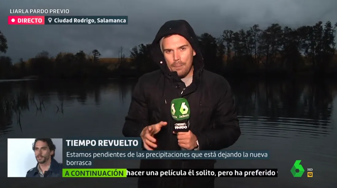 Un reportero del programa ‘Liarla Pardo’ se mete en el Águeda en una conexión en directo   | Imagen 1Concretamente, el reportero se había introducido ?mínimamente eso sí- para hacer la conexión en las aguas del río a su paso por la zona de Las Barcas, siguiendo la ?moda? televisiva de que los reporteros se mojen como si aportase algo a la información. En un momento dado, la cámara enfoca al cielo en dirección a Los Cañitos, apuntando el reportero que ?la borrasca entra por Portugal, que está allí al fondo?, lo que es erróneo, ya que justamente Portugal cae ?por el otro lado?.