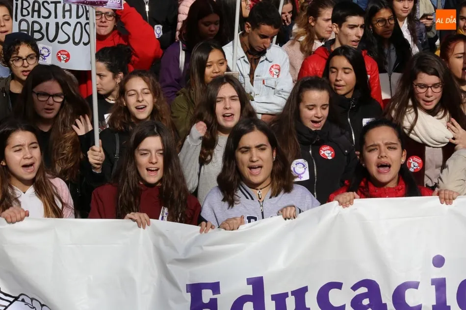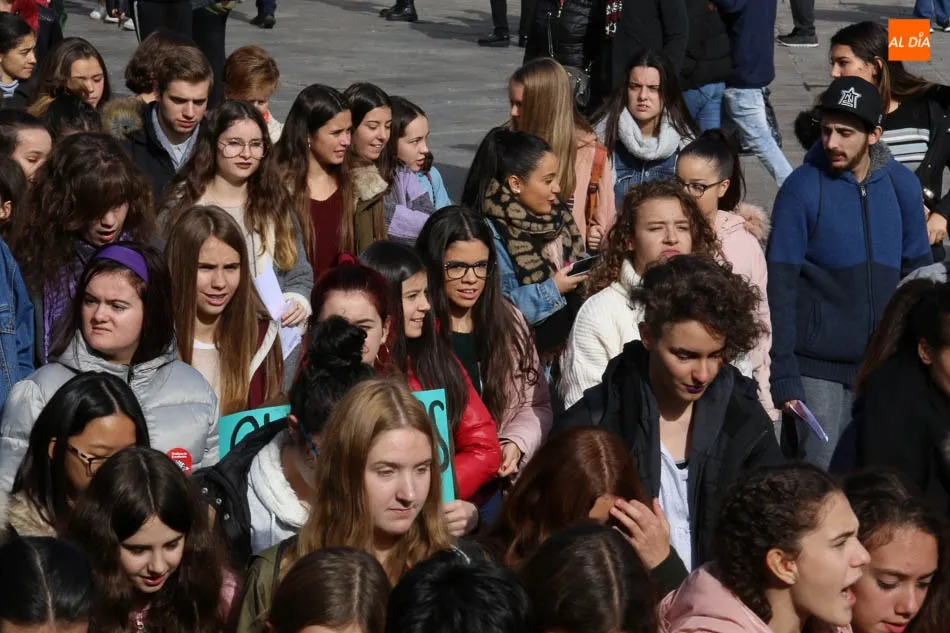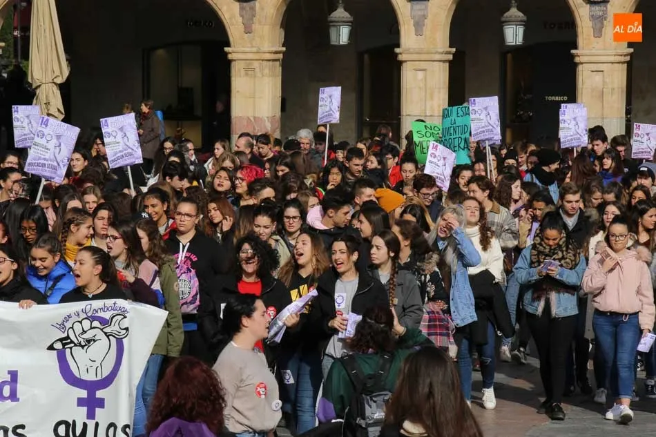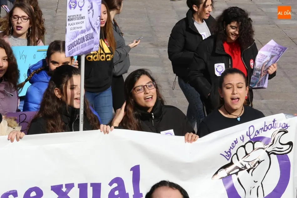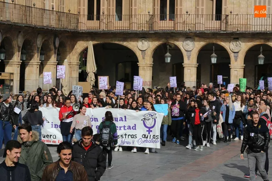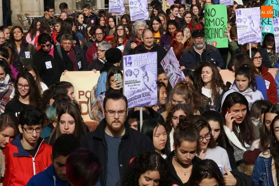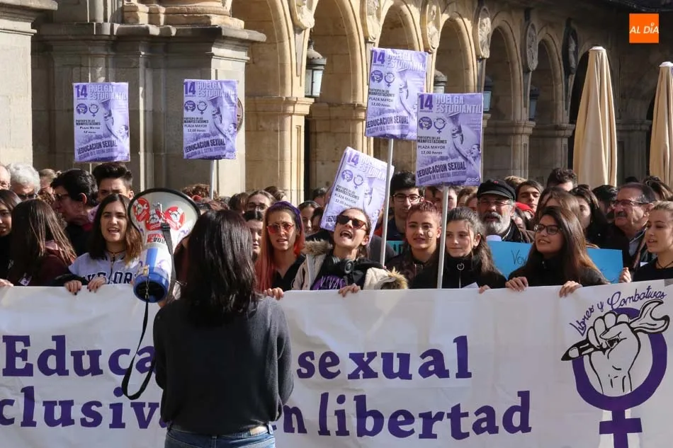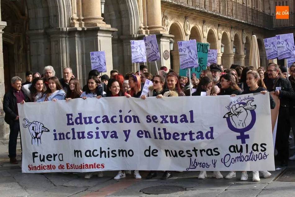 Los estudiantes salmantinos se han manifestado al mediodía en la Plaza Mayor para exigir la derogación de la LOMCE y para reclamar una asignatura de educación sexual inclusiva que sea ?obligatoria y evaluable en todos los centros? para acabar con el machismo en las aulas.