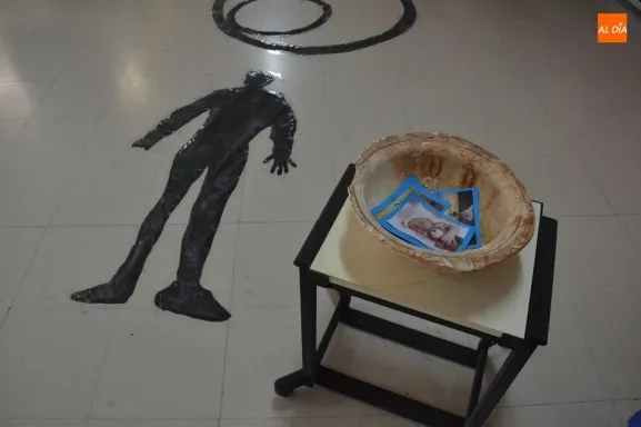 Como elementos destacados, hay una caja con disfraces ?para enmascarar la situación? de maltrato, fotos que recuerdan los buenos momentos (?que se lavan en una palangana para destruirlos?), la silueta de una mujer en el suelo (reflejando ?mi muerte?), una sentencia de un caso de maltrato, o una ?colección de mujeres víctimas de maltrato?.