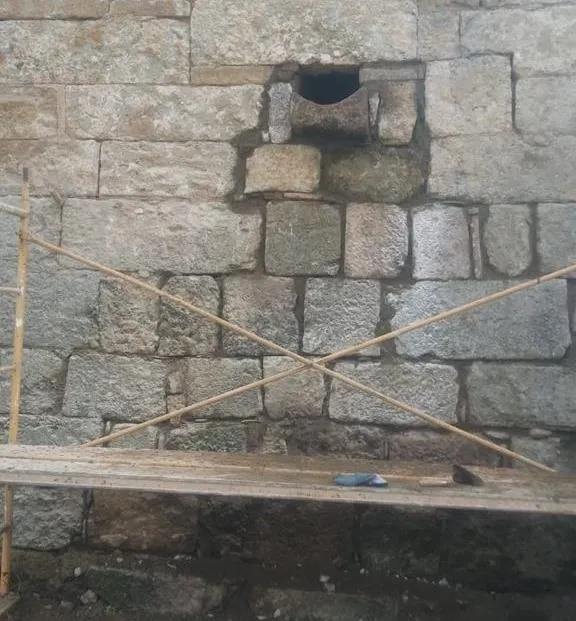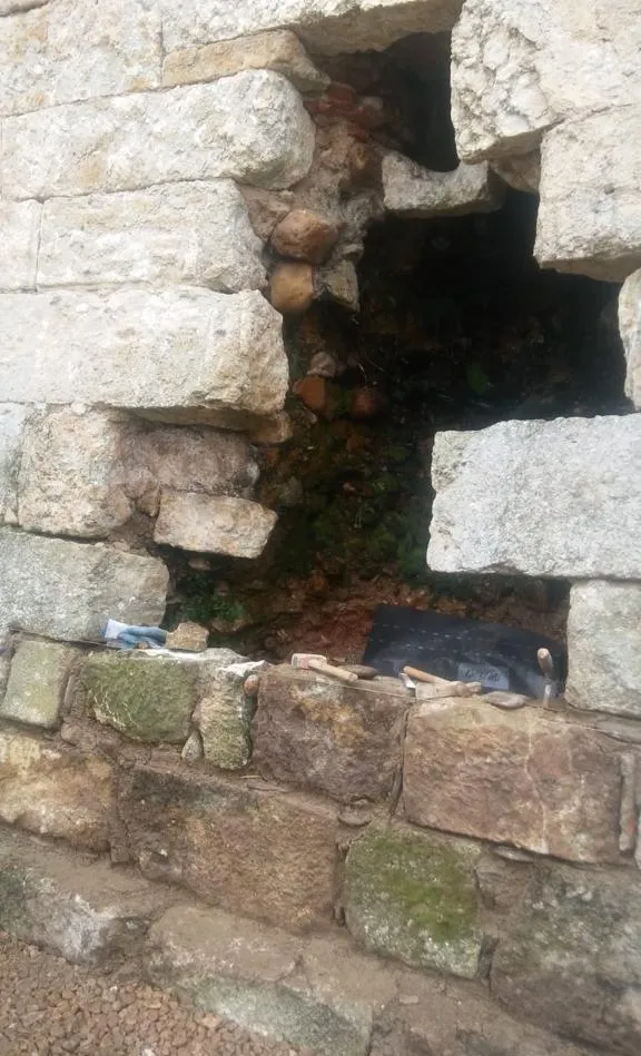 La popular ‘meona’ desaparece de los fosos de la muralla   | Imagen 1Sin embargo, con el paso del tiempo, se habían ido deteriorando las canaletas de piedra por las que discurría el agua, metiéndose en la zona de cal y canto, lo que había ido provocando un progresivo derribo de la fábrica que componía la muralla en esa zona, como se puede comprobar en la imagen de la derecha, perteneciente a la fase inicial de la intervención.
