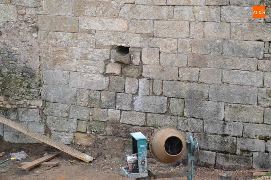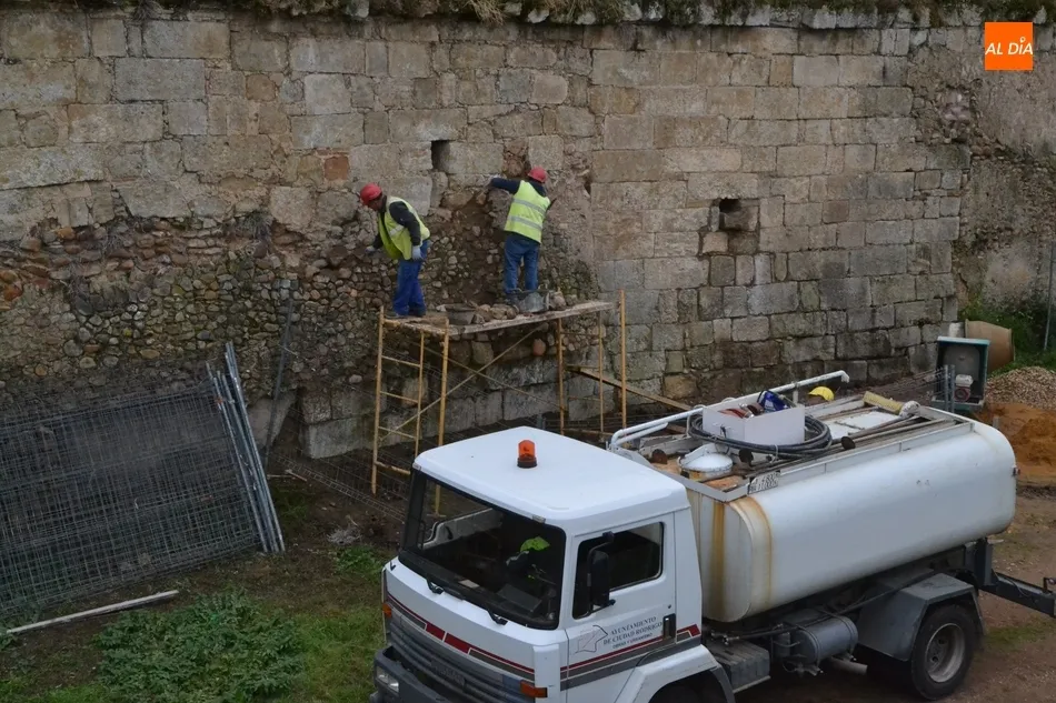 Aprovechando la intervención en ese lugar, el Ayuntamiento de Ciudad Rodrigo ha decidido hacer una reparación adicional a escasos metros, para actuar en una zona deteriorada, como indica Joaquín Pellicer. En este sentido, se han colocado las piedras que había, se la ha hecho recrecer un poco mediante gorrón, y se ha tapado un punto donde ya se habían desprendido varias piedras. Así, se evita que el agua se pueda introducir y provocar un deterioro como el que se ha solucionado justo al lado.
