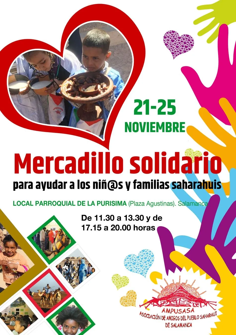 La Asociación de Amigos del Pueblo Saharaui de Salamanca (AMPUSASA) organiza un año más su tradicional mercadillo solidario con el objetivo de recaudar fondos para los proyectos que desarrolla la asociación del que se benefician familias de los campamentos de refugiados del Sáhara occidental.