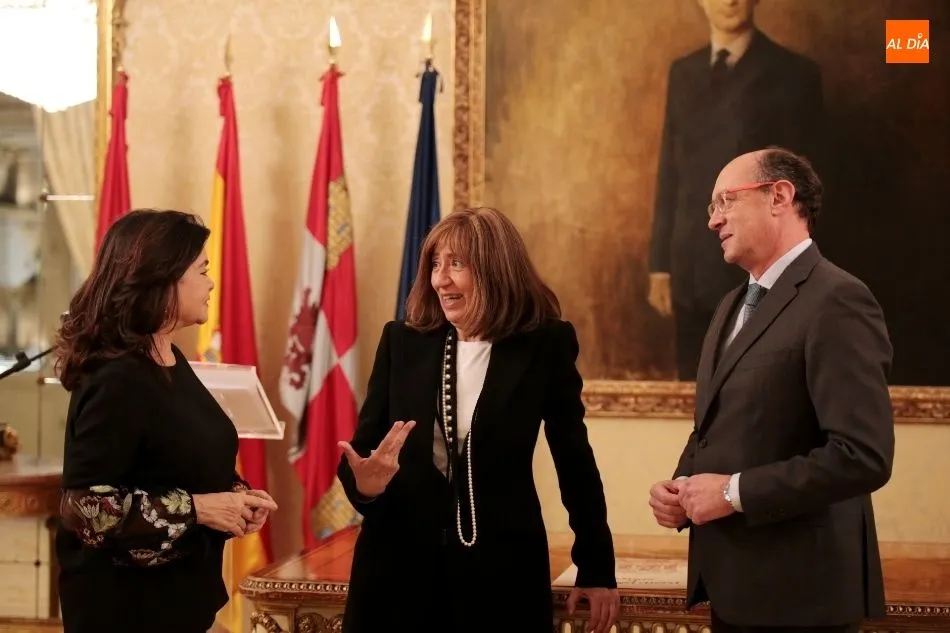 La expresidenta de la Federación Internacional de Farmacia y del Consejo General de Colegios Oficiales de Farmacéuticos, Carmen Peña López, ha recibido este viernes, en el Ayuntamiento, el título de Huésped Distinguida de la ciudad de Salamanca. La cuarta teniente de alcalde, María José Fresnadillo, ejercía de anfitriona, recibía a la homenajeada y le entregaba la prestigiosa distinción.