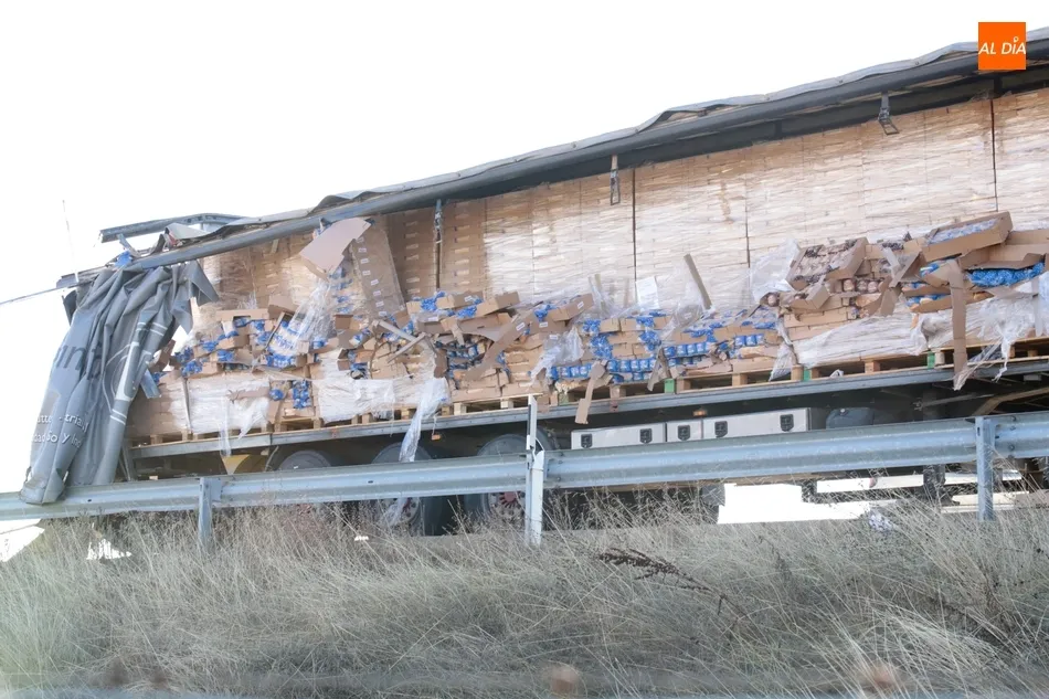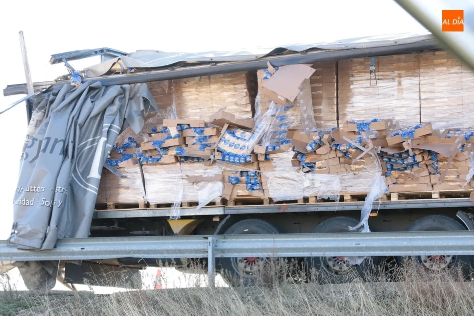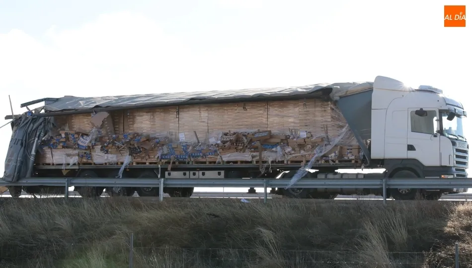 Un camión cargado con pan de molde perdía parte de la carga tras que se le rompiera la lona del remolque, causando retenciones en el tráfico. El suceso tenía lugar este viernes, sobre las 10.30 horas, a la altura del municipio de Calzada de Don Diego, en la A-62 dirección Ciudad Rodrigo.