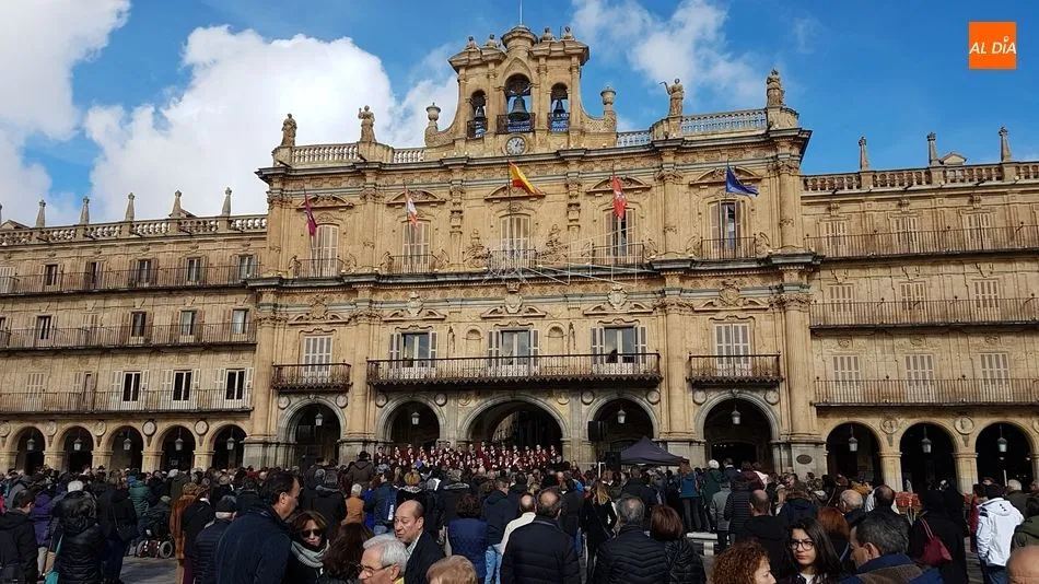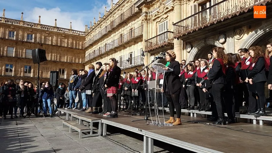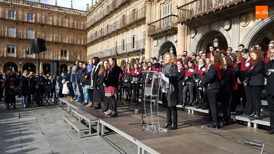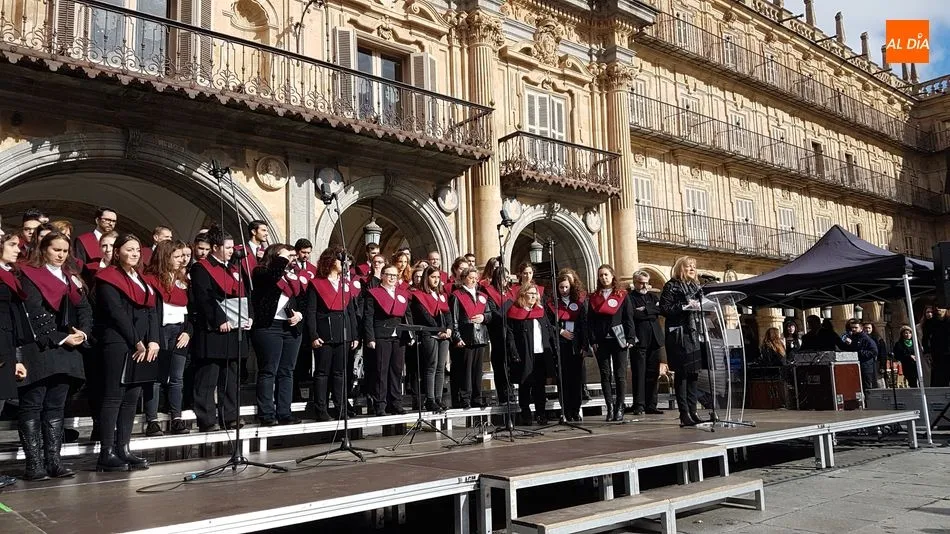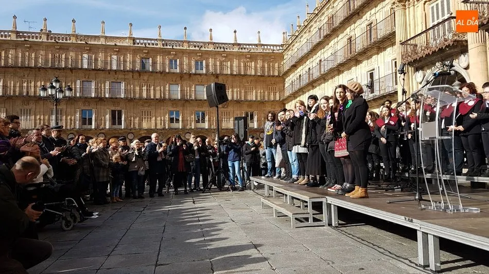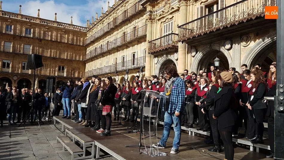 Música del Coro de la Universidad de Salamanca y silencio en memoria de las 44 mujeres asesinadas por sus parejas o exparejas en lo que va de año. Así han recordado este domingo los salmantinos en la Plaza Mayor a las víctimas, coincidiendo con el Día Internacional contra la Violencia de Género.