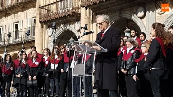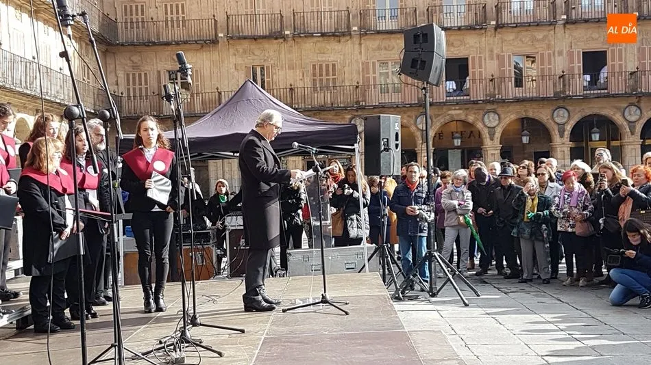 Tras la actuación del coro universitario, dirigido por Bernardo García-Bernalt, un rotundo y contundente José Antonio Sayagués ha leído el manifiesto contra la violencia de género coordinado por la profesora de la Universidad, Marta del Pozo. ?El símbolo más brutal de la desigualdad entre hombres y mujeres?. Así se ha referido el actor salmantino a la violencia machista, primera causa de muerte entre las mujeres en el mundo, con un incremento de víctimas menores, tanto directas como indirectas. Una lacra social, ha dicho Sayagués, que sigue aumentado y que se ha llevado la vida de más de 950 mujeres en España en la última década.