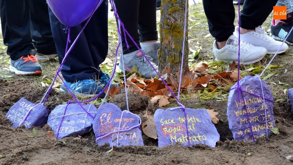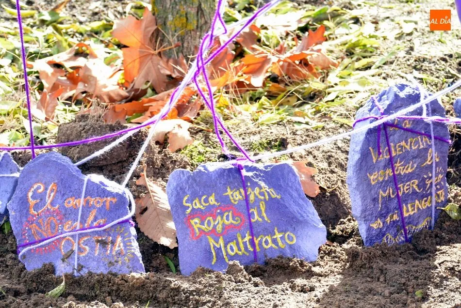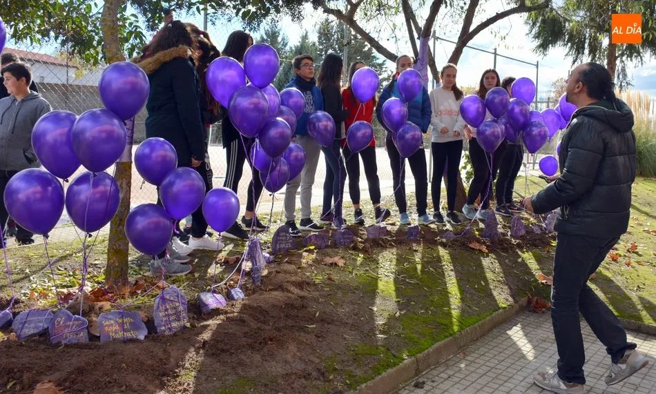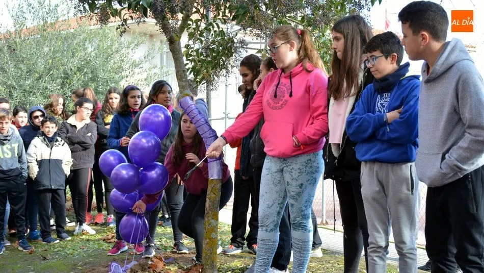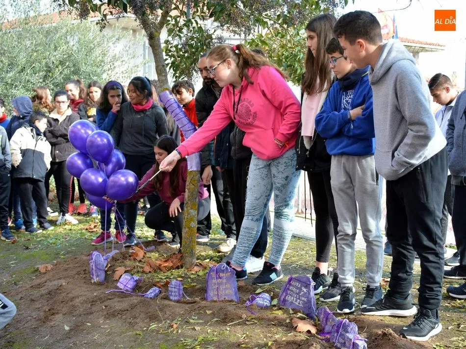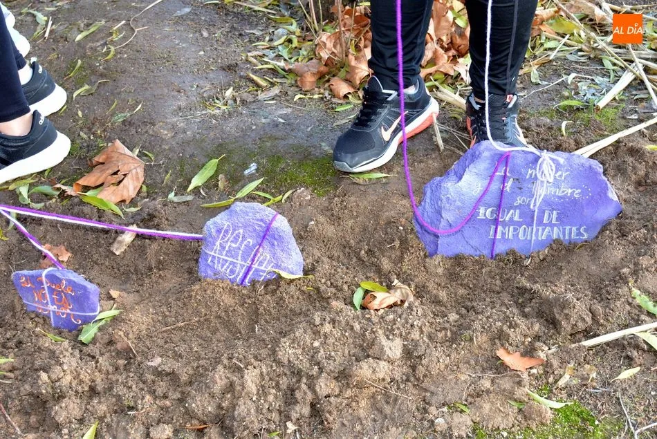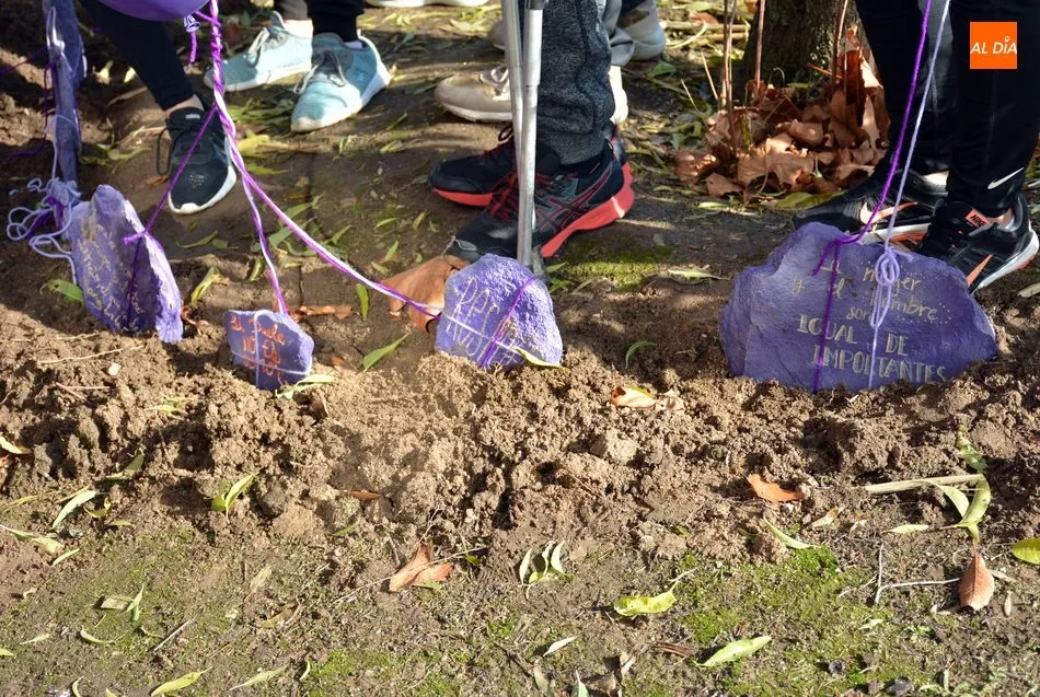 Profesores y escolares se reunieron en torno a los árboles forrados con telas color lila, y donde se habían colocado clavadas en la tierra pequeñas losas de piedras pintadas de morado y con mensajes alusivos al acto, mensajes que hacían referencia a la igualdad entre mujeres y hombres, al respeto y en contra de la violencia.