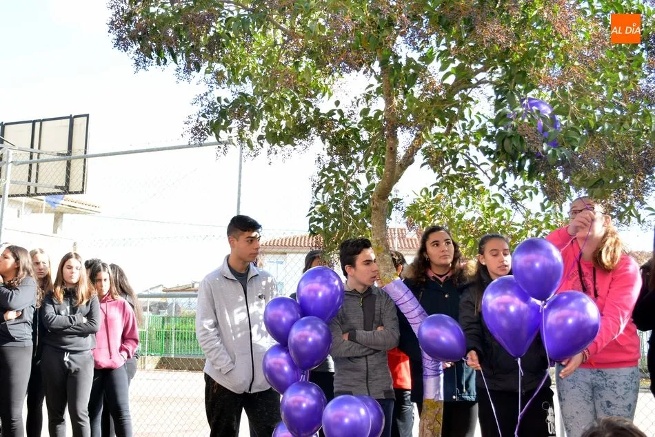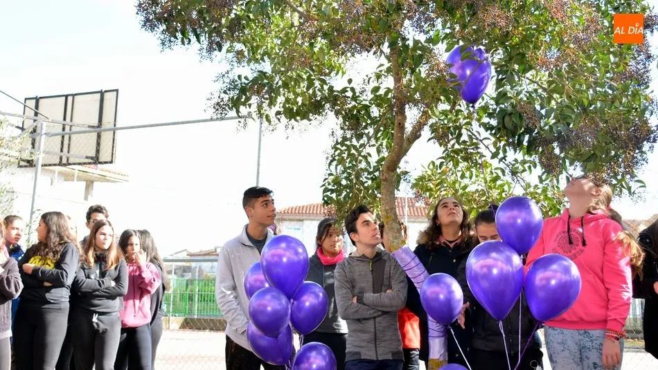 Profesores y alumnos participaron en un acto en el que se leyeron mensajes alusivos a la igualdad y se soltaron globos morados