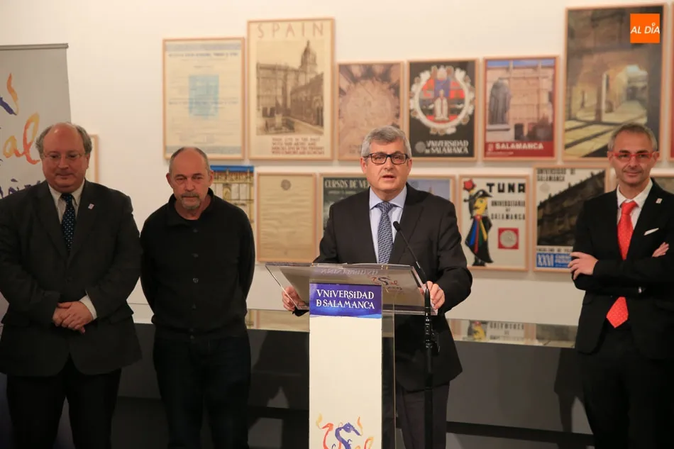 El rector de la Universidad de Salamanca, Ricardo Rivero, y los comisarios, Miguel Ángel Jaramillo y Lucía Lahoz, inauguraban la muestra