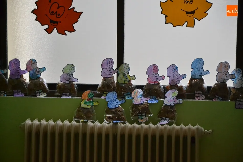 Posteriormente, la Castañera subió hasta el salón de actos, donde había sido preparado un mural especial lleno de frutos carnosos y frutos secos. Asimismo, también estaban expuestas las castañeras que han creado todos los niños, que tienen como elemento distintivo una peculiar falda con hojas.