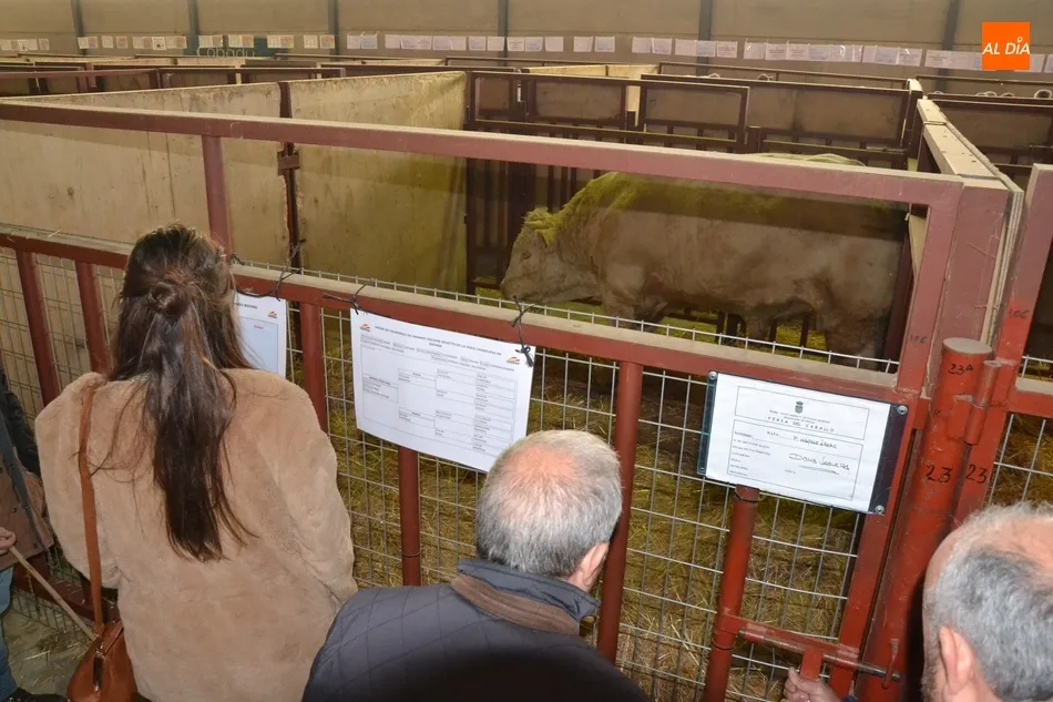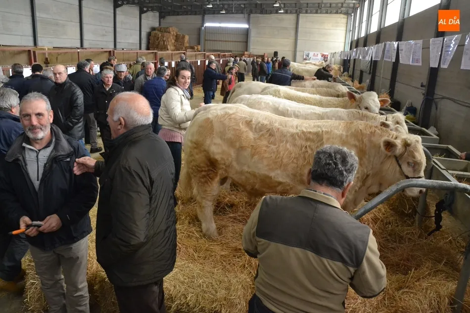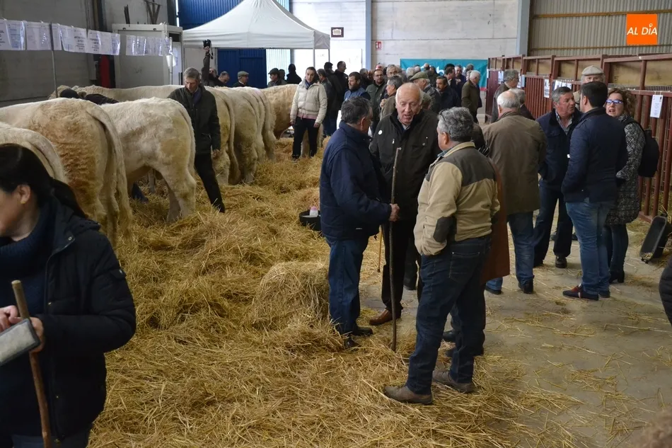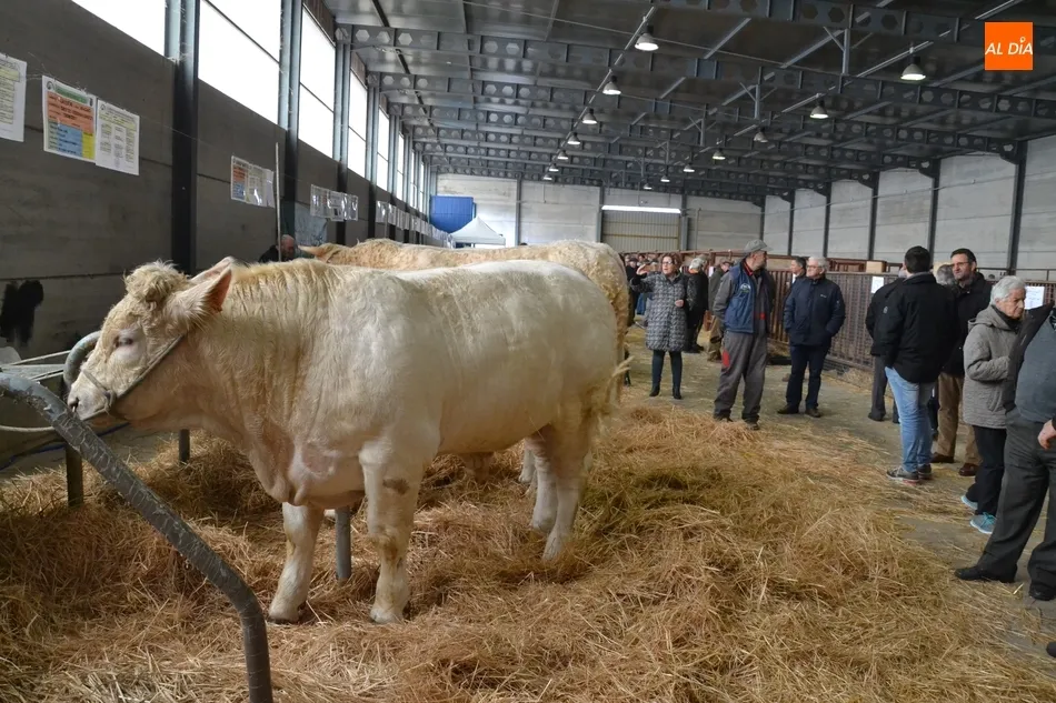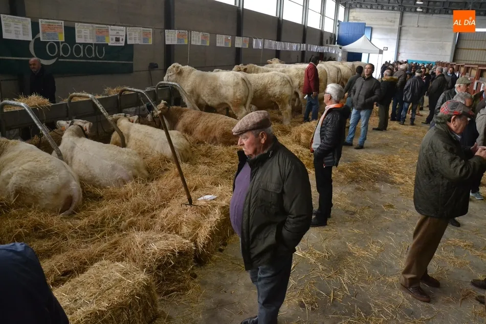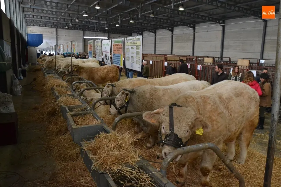 A diferencia de años anteriores, cuando se montaba una carpa en el exterior, este año todo el ganado está dentro de la nave permanente del Ayuntamiento, ocupando prácticamente al completo los boxes con los que cuenta, además de estar desplegado la mayoría del ganado charolés sin boxes en uno de los laterales de la nave, que a media mañana recibió la clásica visita institucional a la Feria.