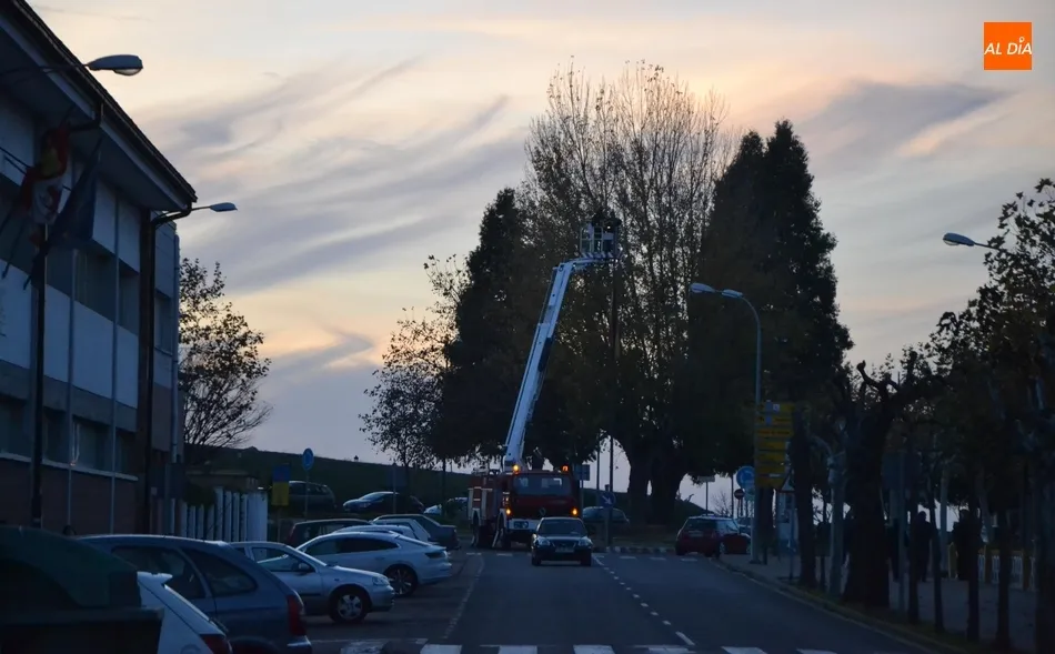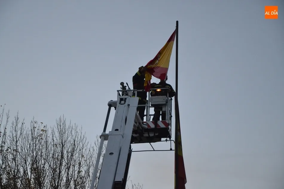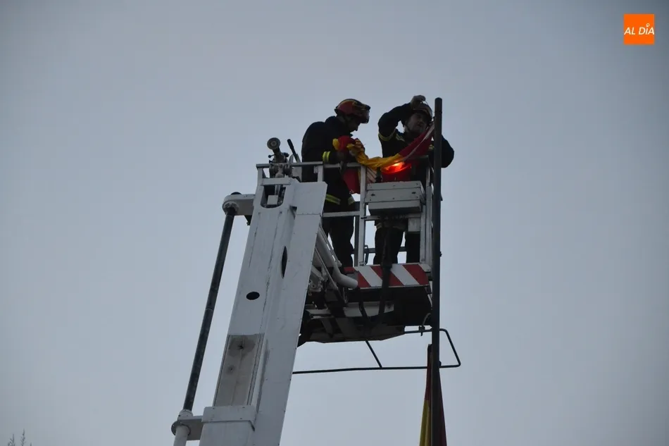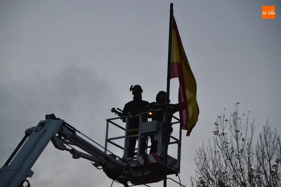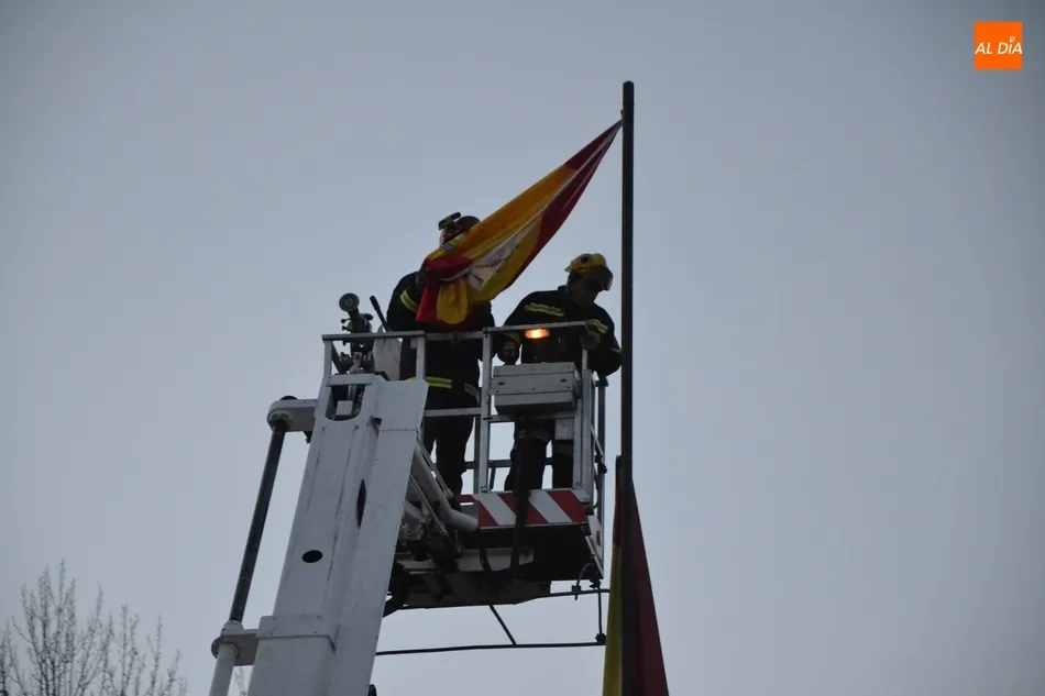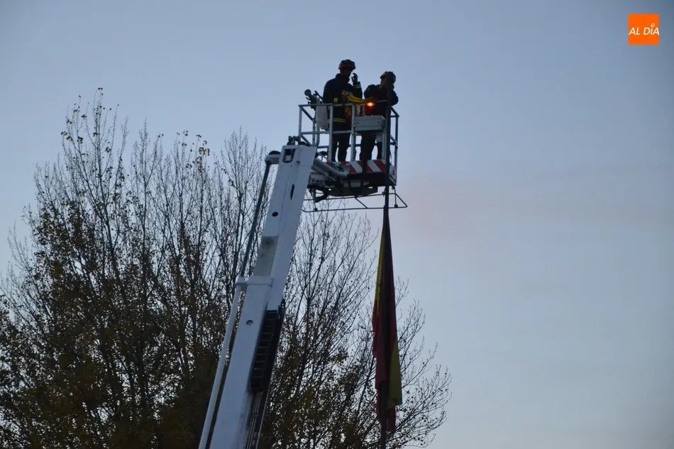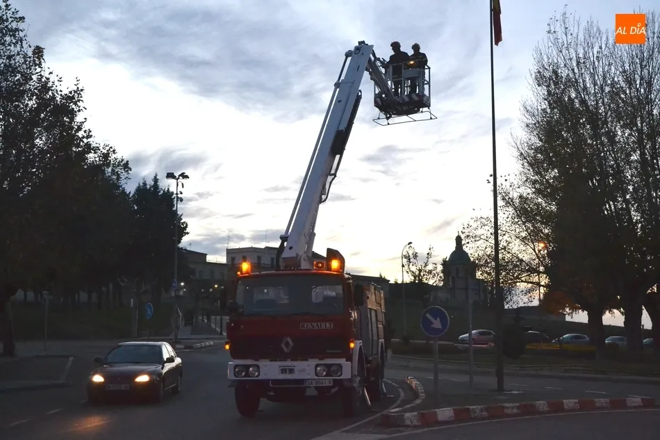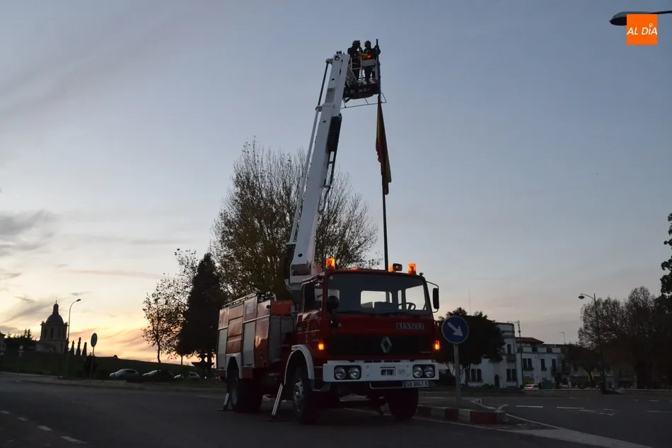 Los Bomberos Voluntarios de Ciudad Rodrigo procedieron en la tarde del lunes ?en el tramo en que ya empezaba a anochecer- a sustituir la bandera de España que se encuentra de forma permanente en el mástil situado en la Glorieta del Árbol Gordo.