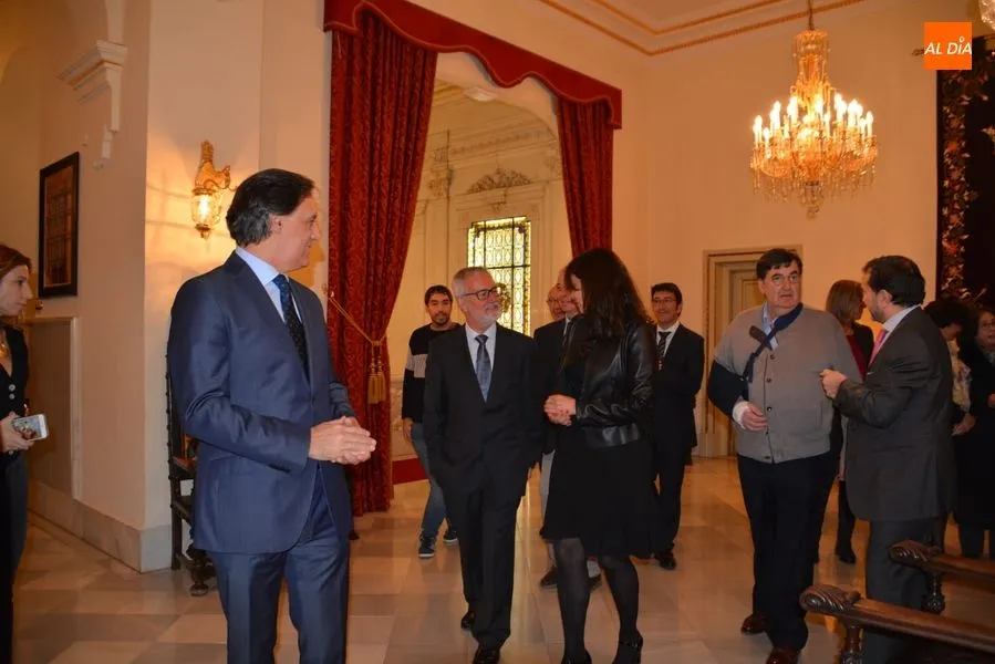 El alcalde en funciones, Carlos García Carbayo, acompañado del presidente de Salamanca Convention Bureau, Alain Saldaña, el vicerrector de Relaciones Internacionales de la Universidad de Salamanca, Efrem Yildiz Sadak y el portavoz de la Cámara de Comercio, Alfredo Miguel de Pablo, ha presidido hoy el acto de distinción de Embajadores Salamanca Convention Bureau, que cumple ya su séptima edición.