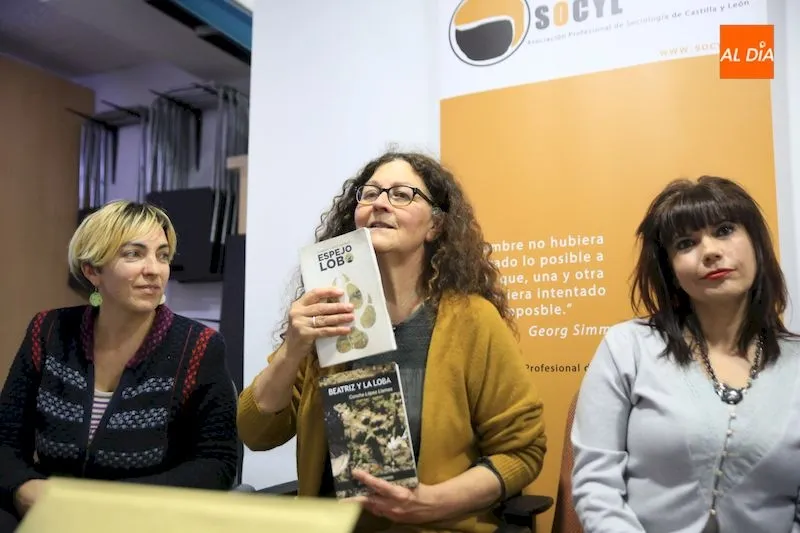 Acompañada por Carmen Velayos (Profesora de Filosofía de la USAL) y Carolina Martín (Ecologistas en Acción), la autora explicó el argumento del libro que narra catorce historias de ficción ubicadas en aquellos entornos de la Península, incluido Portugal, donde el lobo coexiste con el ser humano, en las que se dan a conocer las diferentes causas que hacen peligrar su salud etológica y hasta su supervivencia: ganadería extensiva, regulación-control de la especie, caza, veneno, fuego o furtivismo, entre otros.