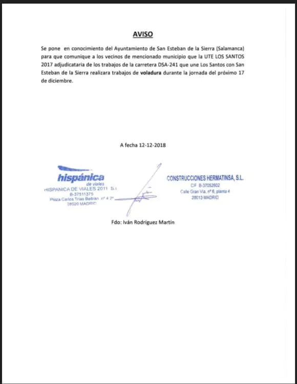 La empresa que lleva a cabo las obras de mejora en la carretera DSA-241 que comunica Los Santos con San Esteban de la Sierra ha anunciado que el próximo lunes, 17 de diciembre, se llevarán a cabo voladuras controladas para remover roca en algunos puntos del trazado. Se aconseja precaución a aquellos que tengan que acercarse a la citada vía y sus inmediaciones.
