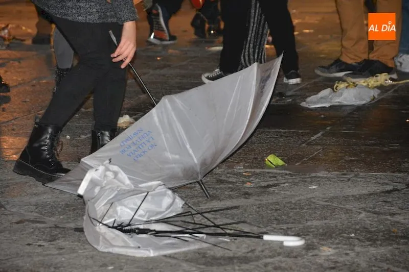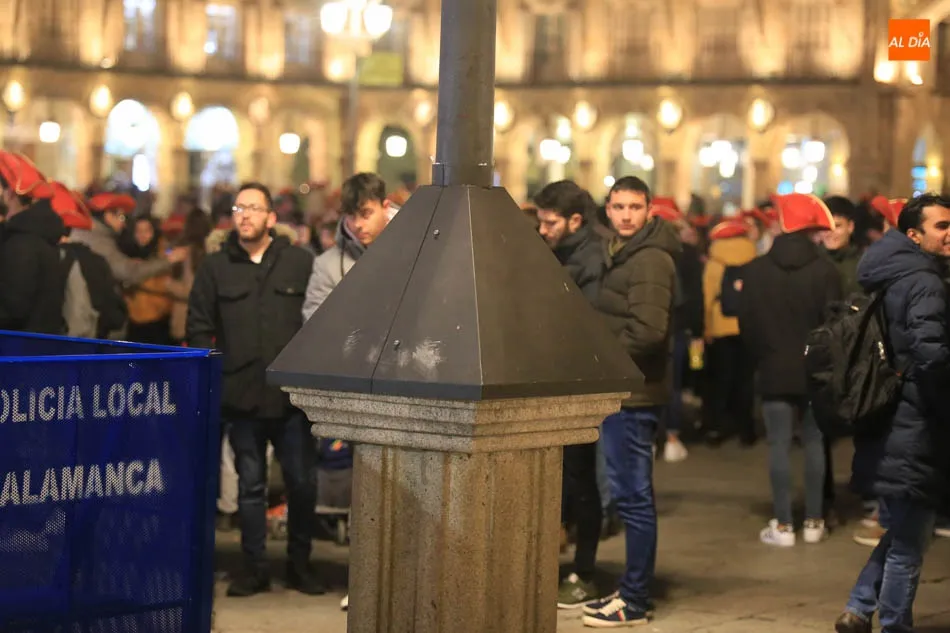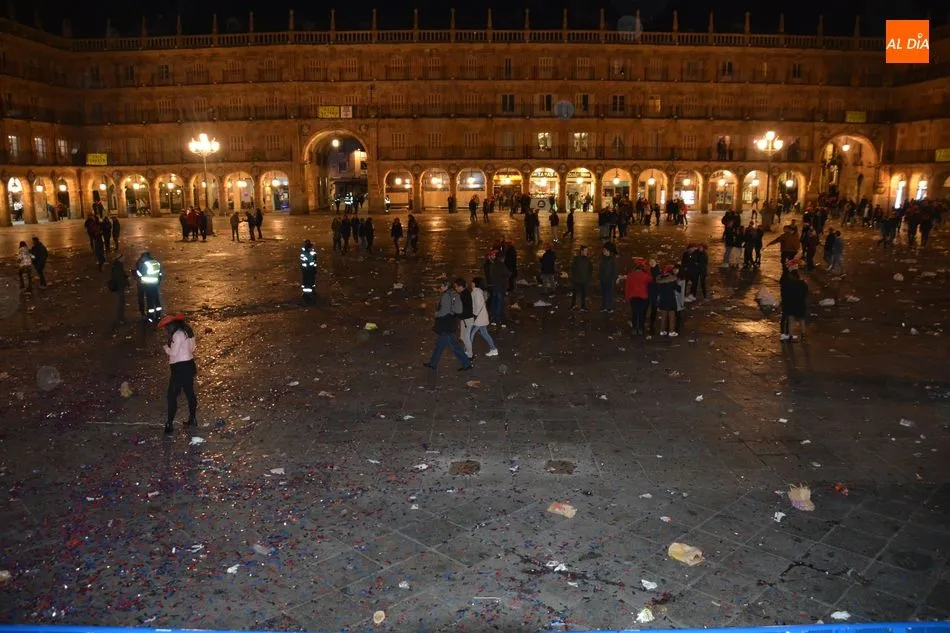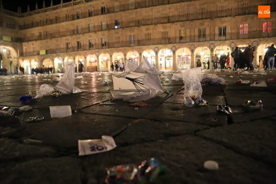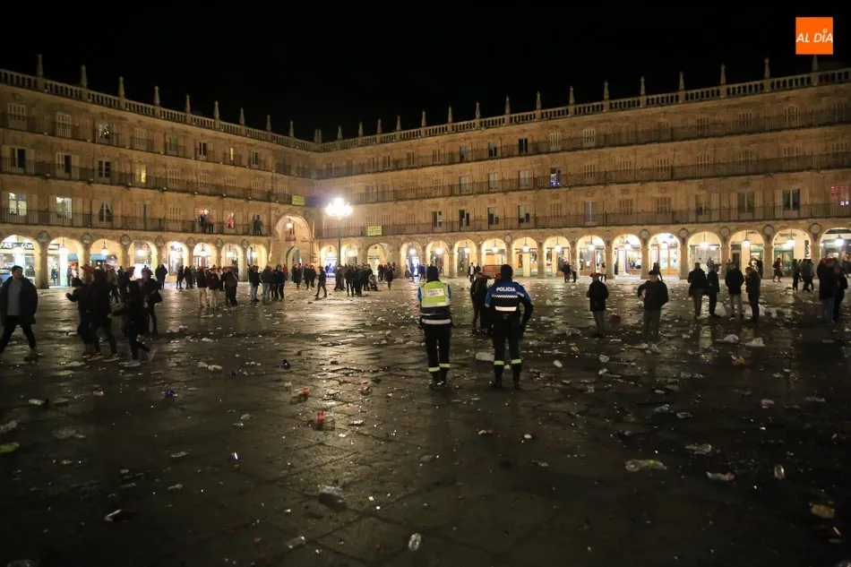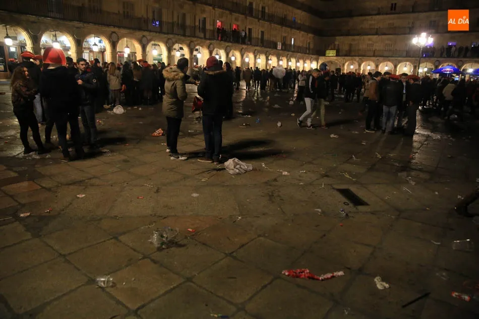 La celebración del Fin de Año Universitario en Salamanca dejó la misma estampa que en ocasiones anteriores una vez se terminó el espectáculo que albergó a cerca de 22.000 personas en la Plaza Mayor.