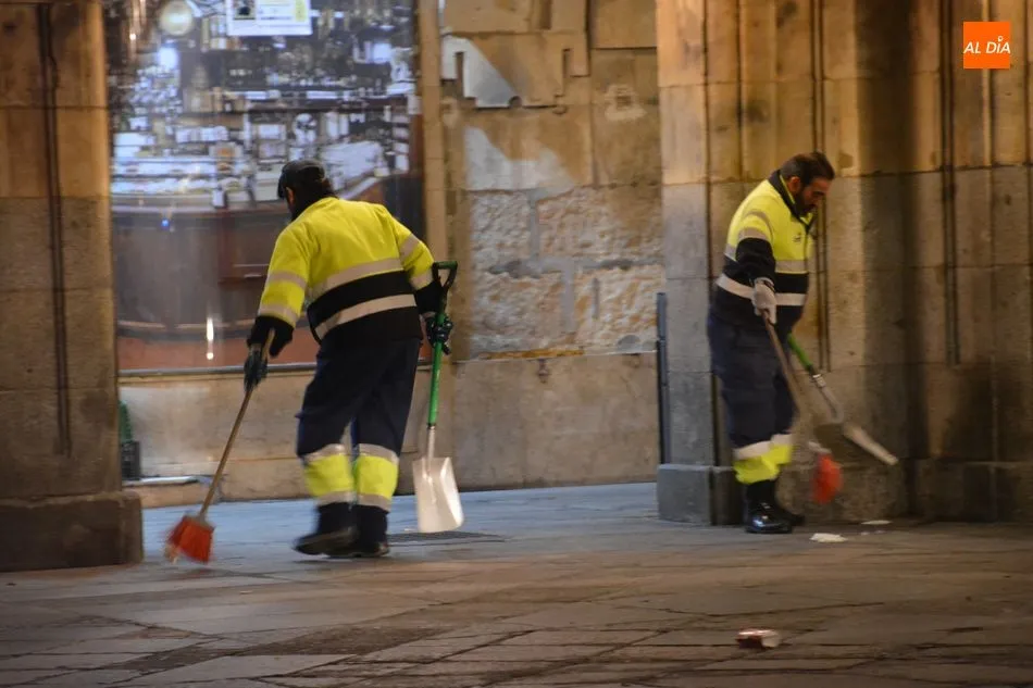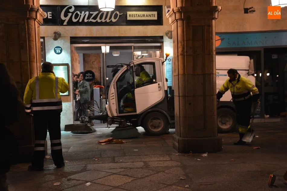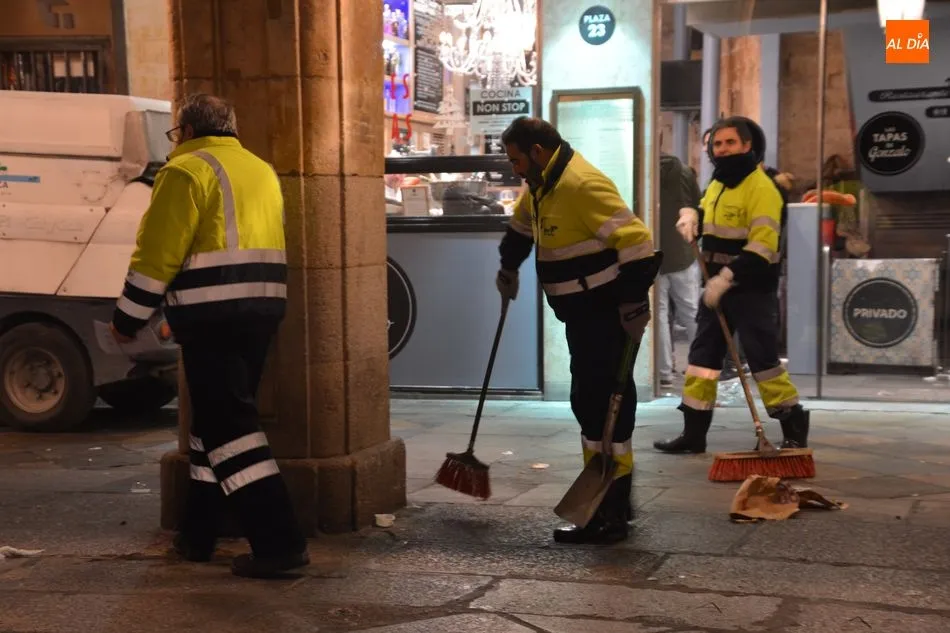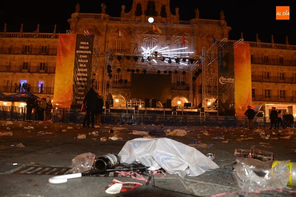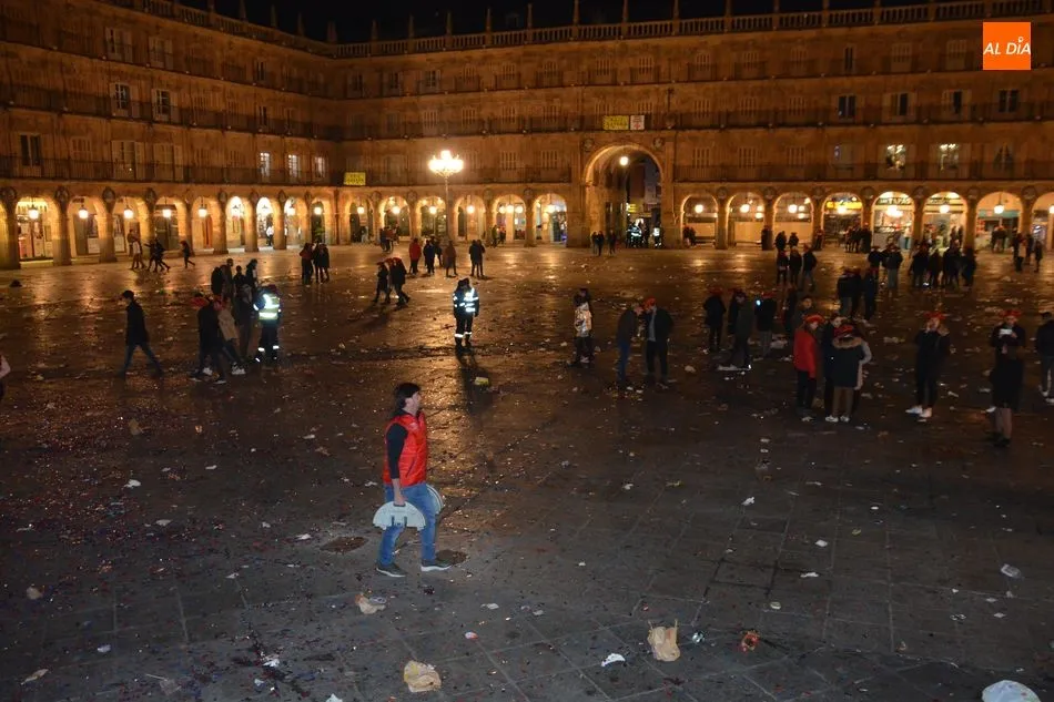 Los trabajadores del servicio de limpieza puesto en marcha por el Ayuntamiento tuvieron así una larga noche de trabajo a fin de limpiar la suciedad y los desperdicios generados por las más de 22.000 personas que abarrotaron la Plaza Mayor y que volvieron a dejar patente la otra cara del Fin de Año Universitario.