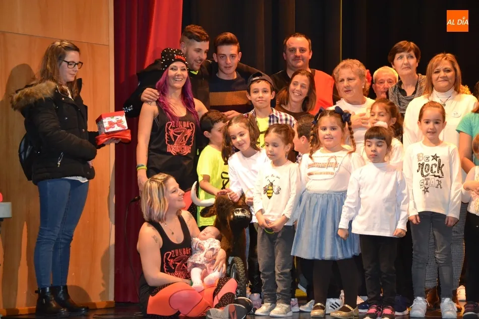 Concluida esta última exhibición, todos los participantes en la gala subieron al escenario para hacer una gran foto de familia al mismo tiempo que las responsables de la Asociación Bobolino y Piruleta hacían entrega a ASCOL de lo recaudado: 1.375,50?. A la gala asistieron un total de 455 personas, abonando cada una de ellas 3?.