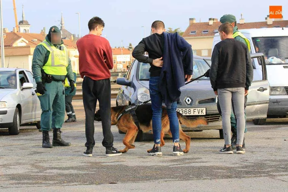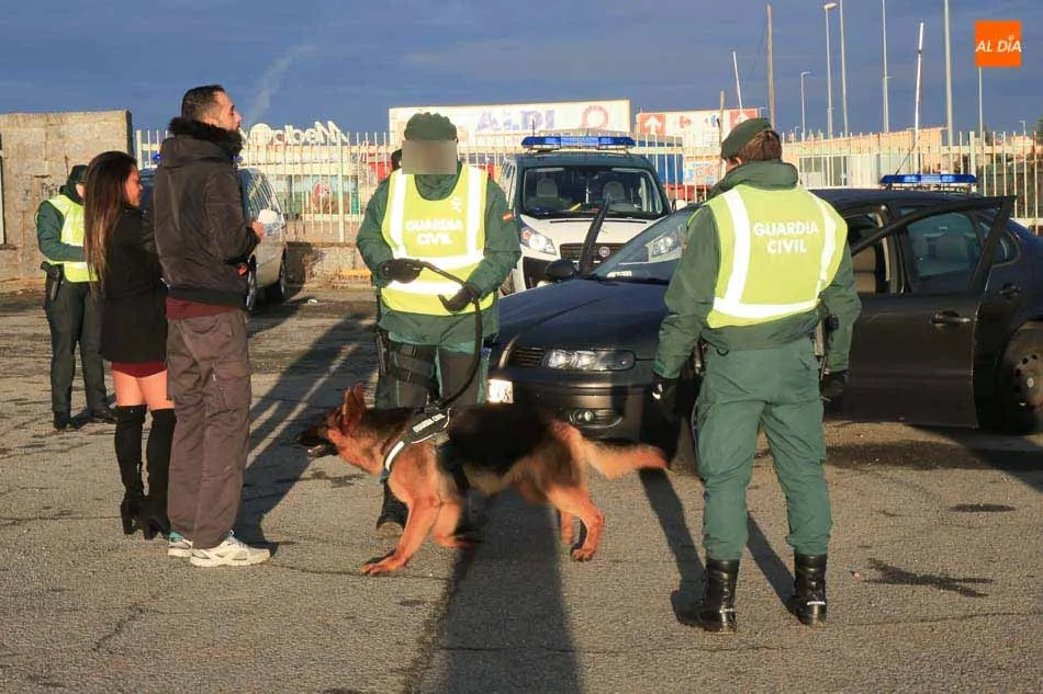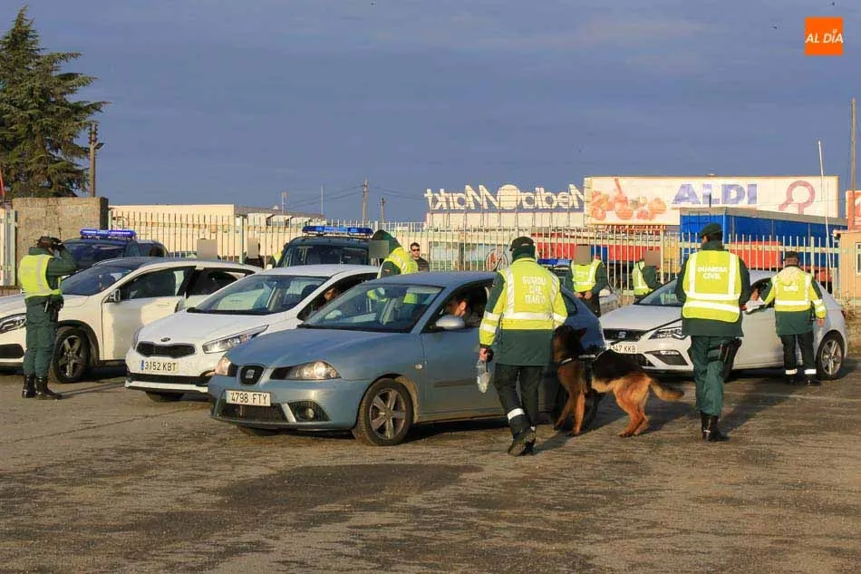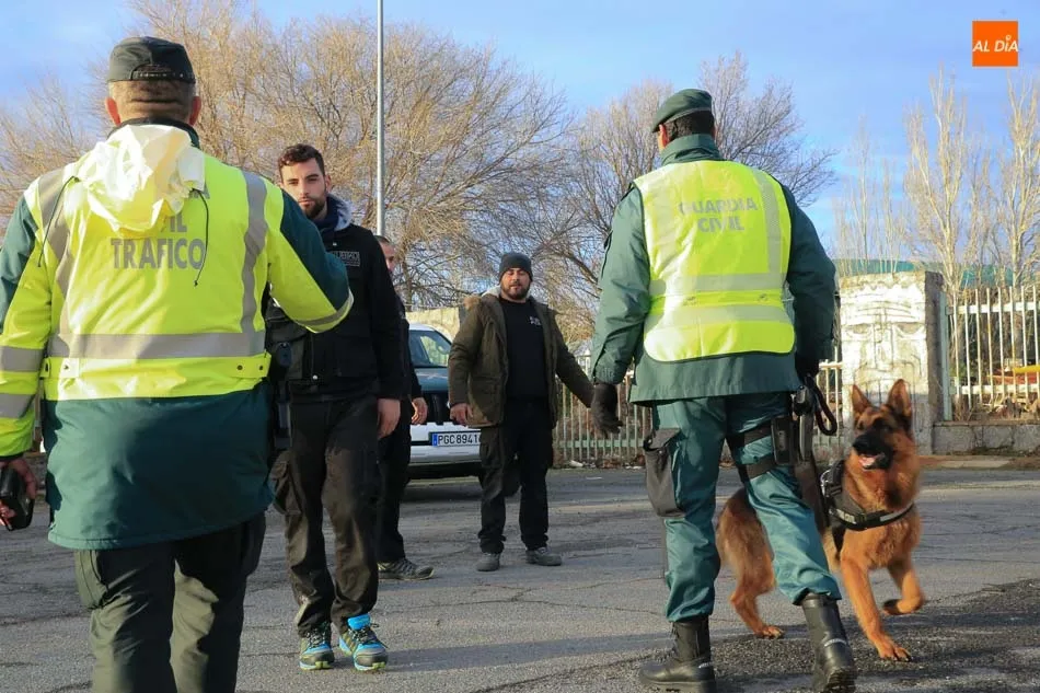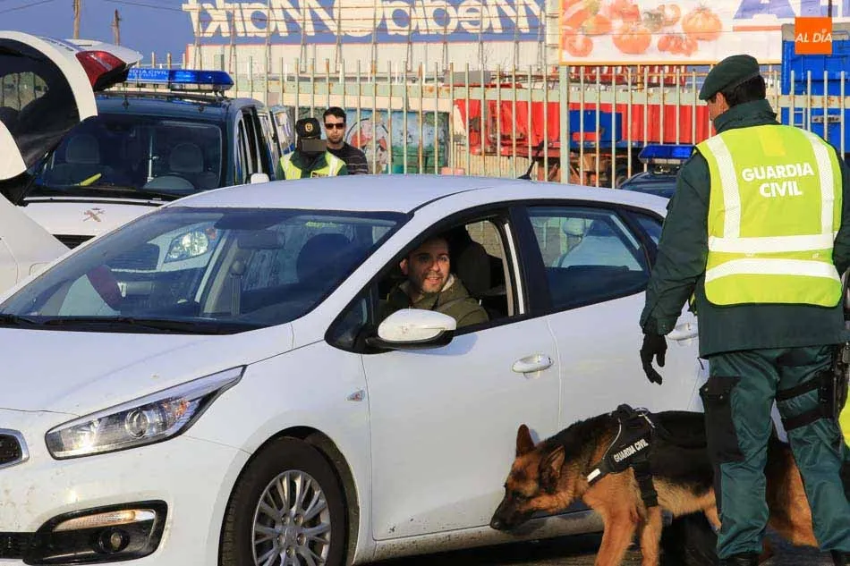 Agentes de la Guardia Civil y la Policía Local registraron vehículos con la ayuda de perros adiestrados durante toda la madrugada y a primera hora de la mañana