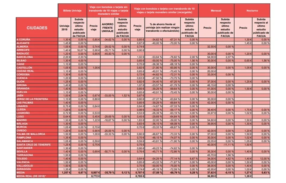 Salamanca es una de las ciudades españolas con las tarifas de autobús urbano más baratas en sus diferentes modalidades, según el estudio anual realizado por Facua-Consumidores en Acción y en el que analizan las tarifas del transporte público en 38 ciudades. En el lado contrario se sitúan Madrid, Barcelona y Girona que siguen siendo las ciudades con las tarifas de autobús más caras.