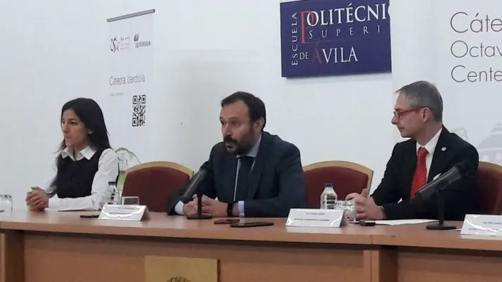 El rector de la Universidad de Salamanca, Ricardo Rivero; el director de Innovación, Sostenibilidad y Calidad de Iberdrola, Agustín Delgado; la vicerrectora de Investigación y Transferencia, Susana Pérez; la directora de la Cátedra Iberdrola VIII Centenario, Susana Lagüela, y el coordinador global de ?Smart Solar? en Iberdrola Clientes, Luis Buil, presentaron este lunes en la Escuela Politécnica Superior de Ávila los resultados del primer año de trabajo de la Cátedra Iberdrola VIII Centenario.