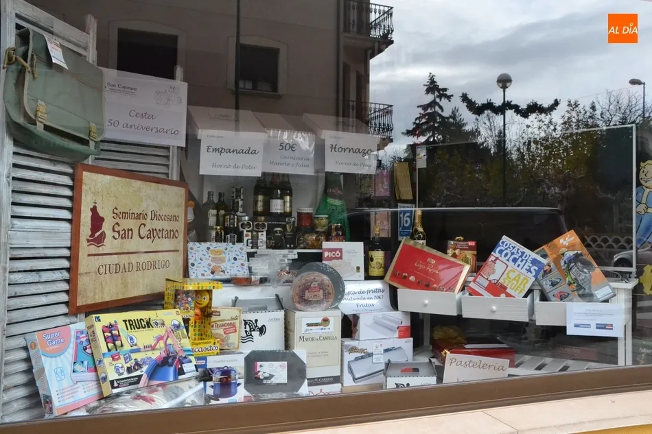 La cesta creada por el Seminario está valorada en 1.500? y se puede contemplar en el escaparate de DT Informática que da a la calle San Fernando. Como se puede ver en las imágenes, la cesta incluye una gran televisión, un microondas, diversos productos alimenticios, bebidas, material escolar, juegos para niños, y vales para compras en varios establecimientos, entre otros productos.