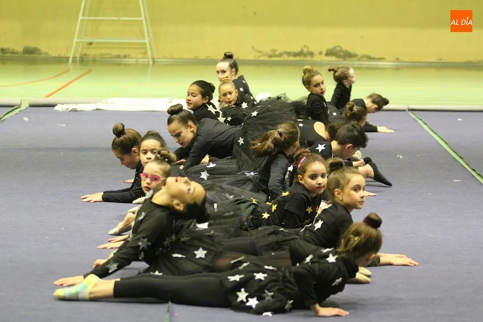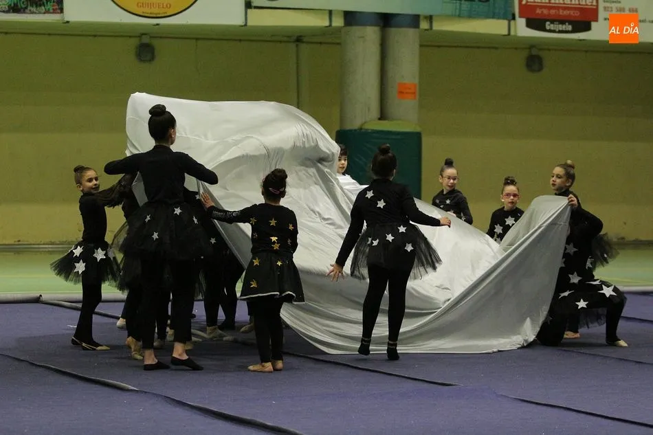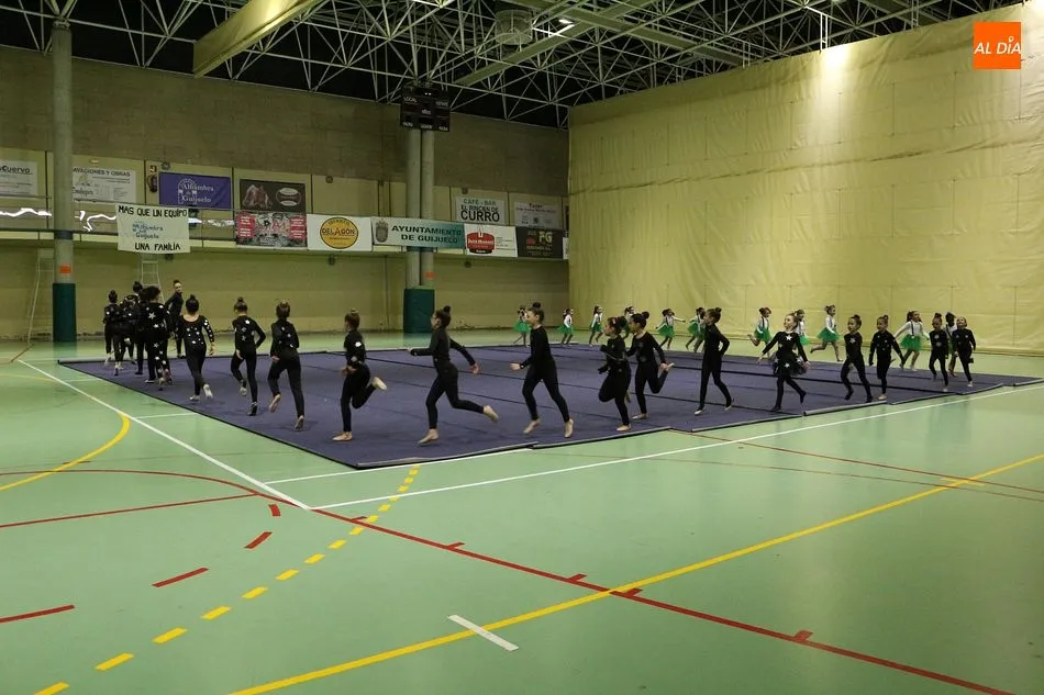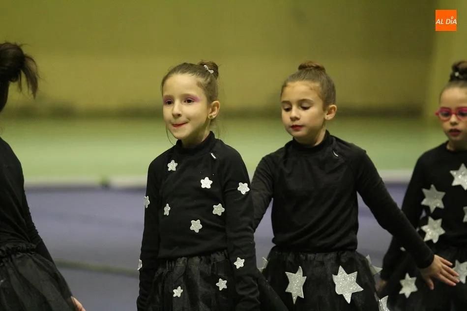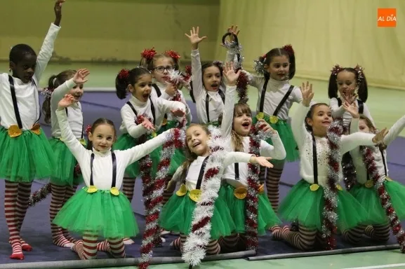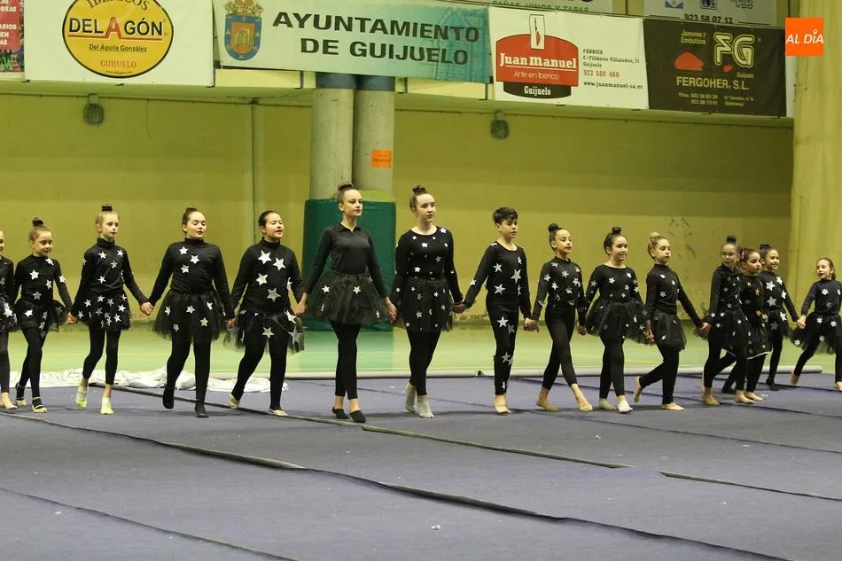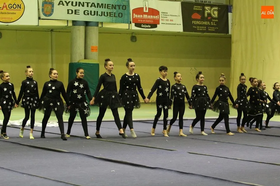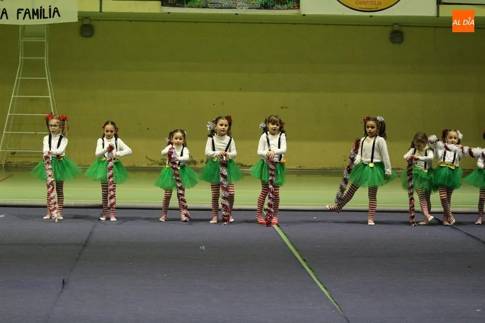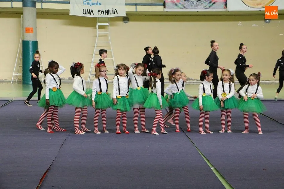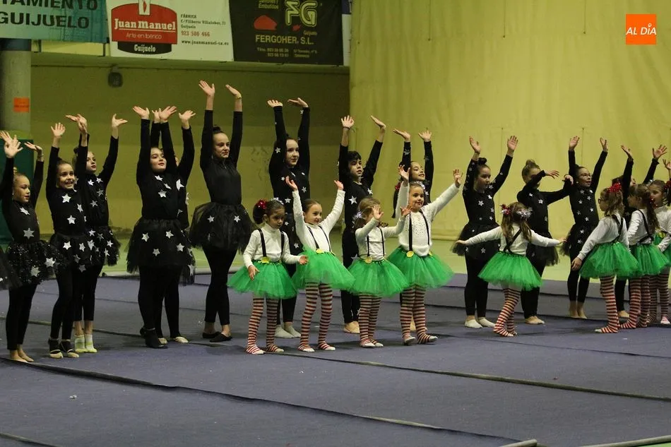 La escuela de gimnasia rítmica de Guijuelo ha ofrecido esta tarde una exhibición de Navidad en el pabellón municipal de deportes. En torno a 150 personas se han dado cita entre el público para ver a las jóvenes gimnastas realizar varios ejercicios, comenzando con unos calentamientos y más tarde un ejercicio conjunto para el grupo de pequeñas, que debutaba ante el público y a continuación las mayores.