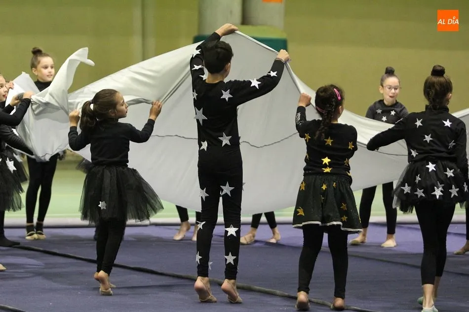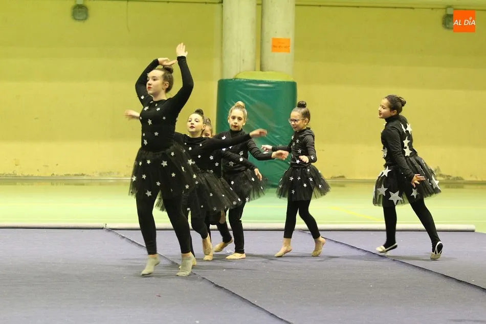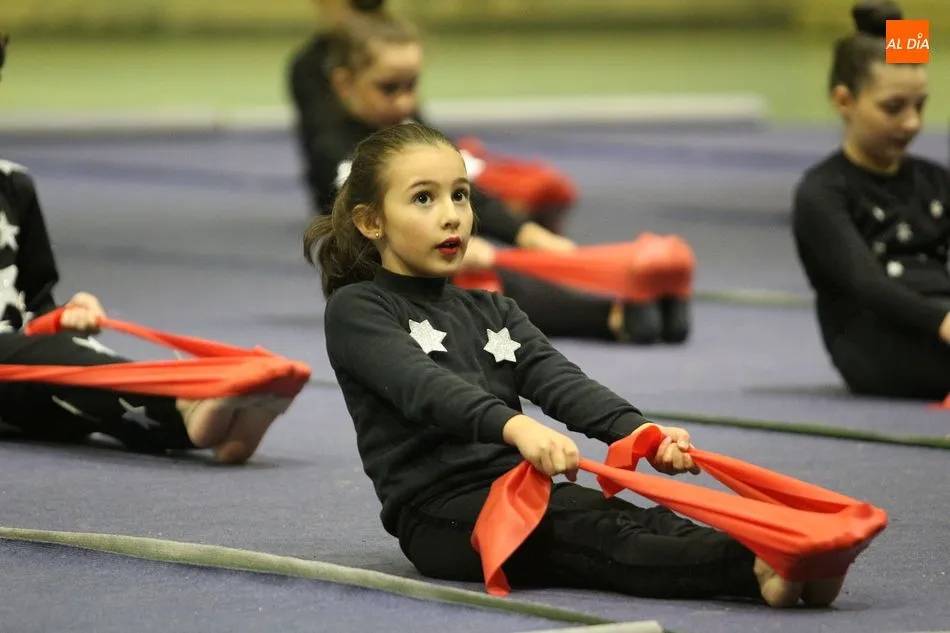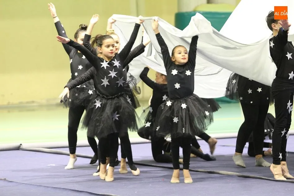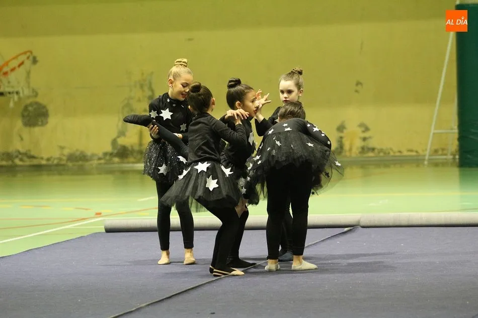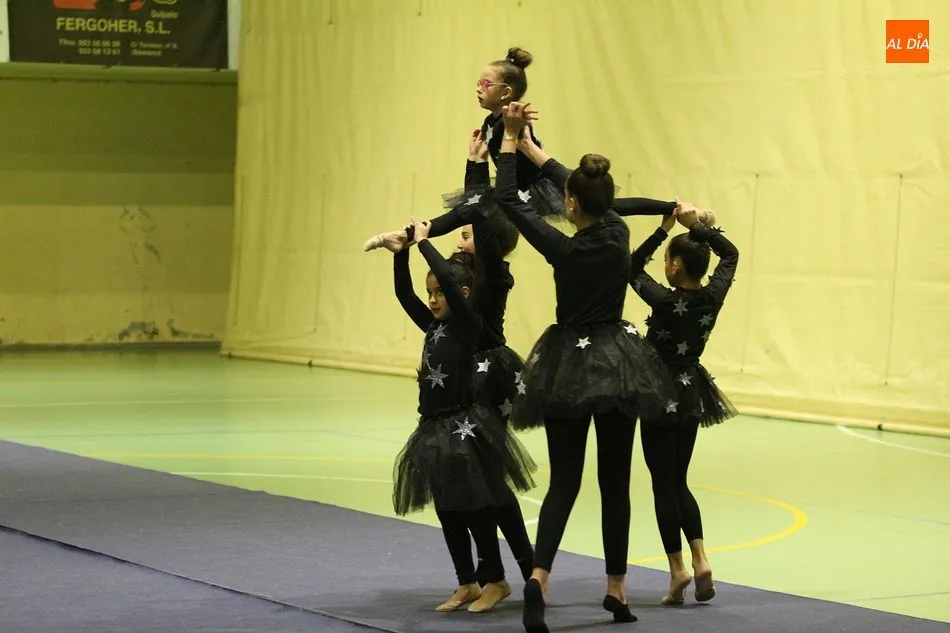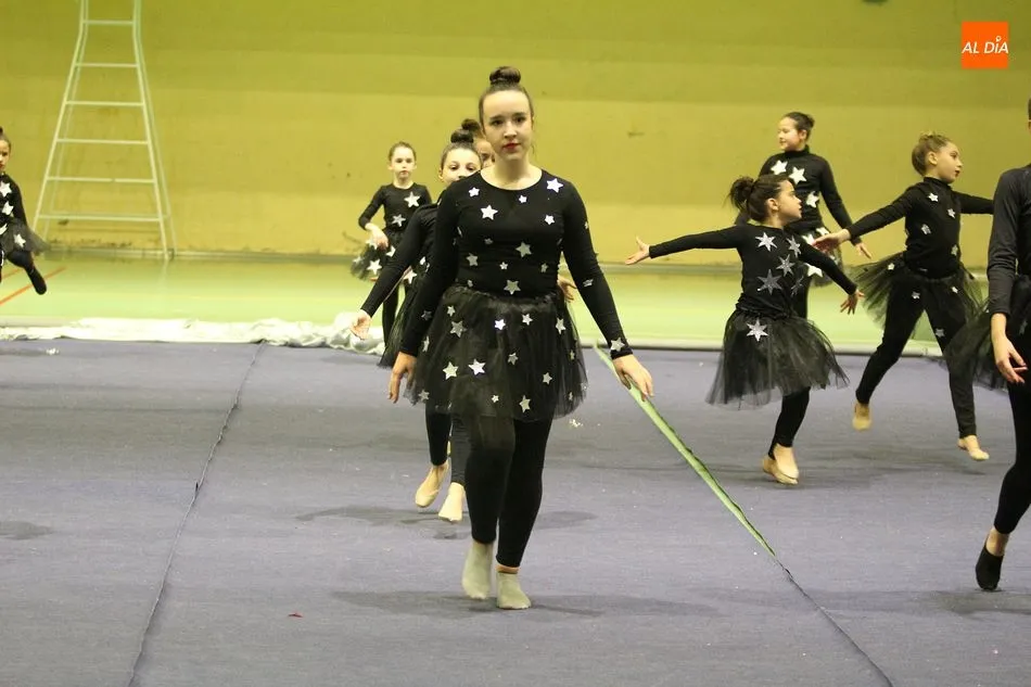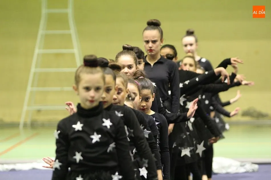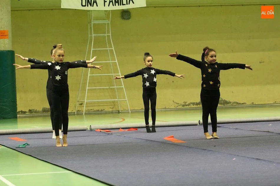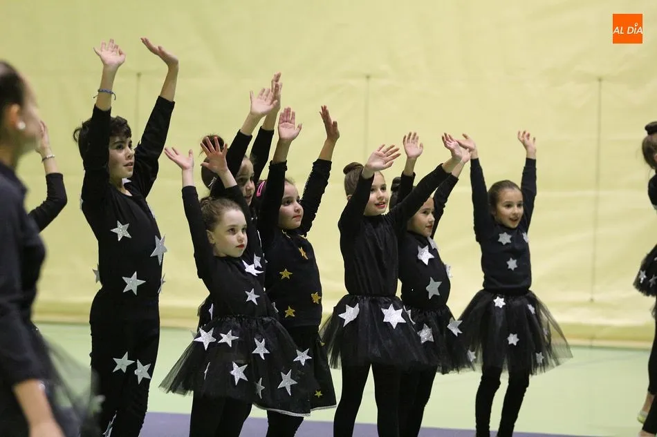 La escuela de gimnasia rítmica de Guijuelo ha ofrecido esta tarde una exhibición de Navidad en el pabellón municipal de deportes. En torno a 150 personas se han dado cita entre el público para ver a las jóvenes gimnastas realizar varios ejercicios, comenzando con unos calentamientos y más tarde un ejercicio conjunto para el grupo de pequeñas, que debutaba ante el público y a continuación las mayores.