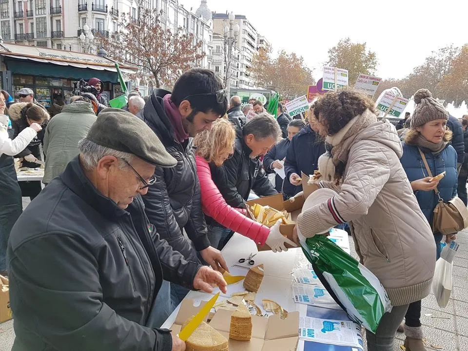 En el acto, de carácter reivindicativo, se ha reunido un centenar de ganaderos con sus pancartas, y ha incluido el reparto de raciones de queso de oveja entre los ciudadanos de Valladolid que esta mañana pasaban por una de las arterias principales de la ciudad, la calle Santiago con la plaza Zorrilla. Además, han repartido unas octavillas en las que explicaban a los consumidores qué pide el sector: un precio digno por su trabajo, para lo que la industria tiene que pactar unos contratos estables con precios dignos que tengan en cuenta el coste de las explotaciones, y también la mediación de la Consejería, puesto que tiene la capacidad para tutelar un marco estable de negociación en el que se defiendan los intereses de la parte más débil de la cadena, los productores.