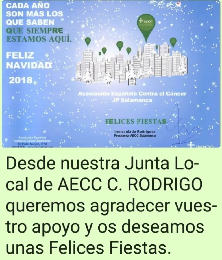 Del ámbito de entidades, hemos recibido felicitaciones de la Asociación Española contra el Cáncer, Asaja, la Asociación Mirobrigense de Diabetes, los Bomberos Voluntarios, Cáritas, la Diócesis de Ciudad Rodrigo, el Gabinete de Comunicación del PSOE de Salamanca, el IES Fray Diego Tadeo, el Club Deportivo III Columnas y Manos Unidas.
