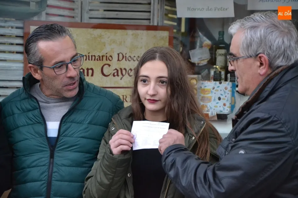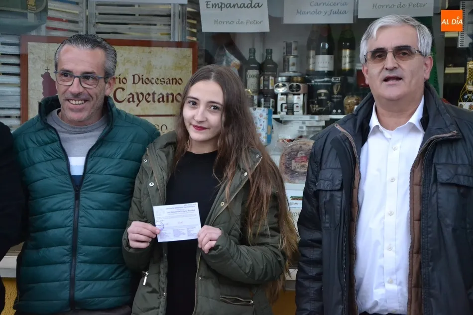 La suerte ha sonreído a la joven de 16 años Alba Sánchez Martín, residente en Ciudad Rodrigo y Fuenteguinaldo, a quién su tío le regaló la papeleta con el 3347, cuatro últimas cifras del Gordo del Sorteo (que fue el 03347). Alba Sánchez se acercó en la tarde del miércoles acompañada por varios familiares hasta DT Informática, donde ha estado expuesta la cesta, para llevársela para casa.