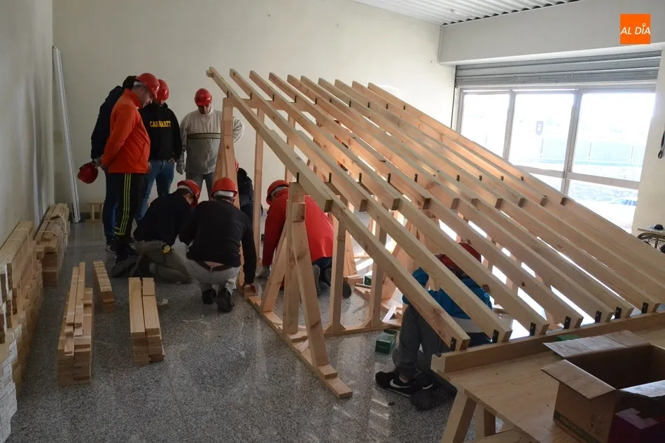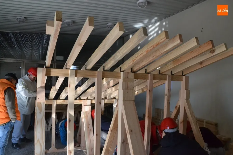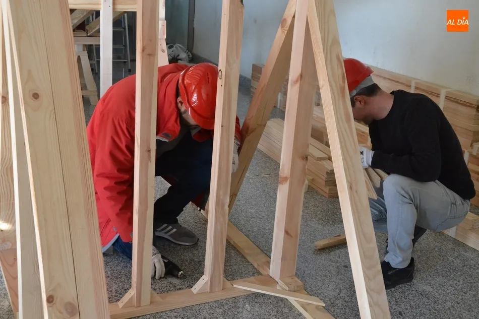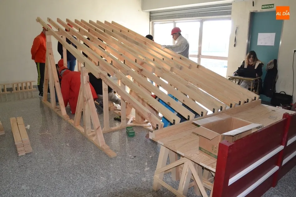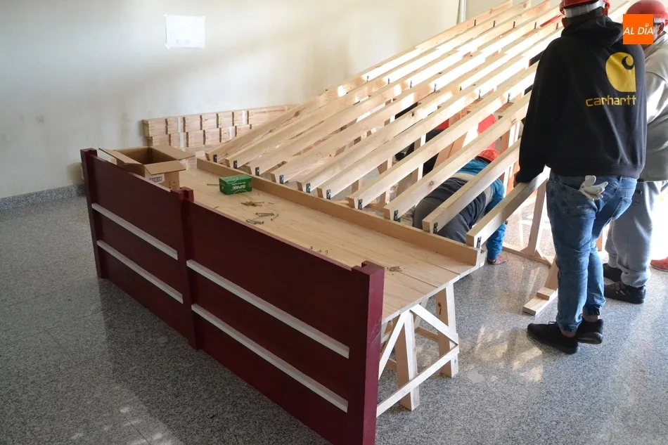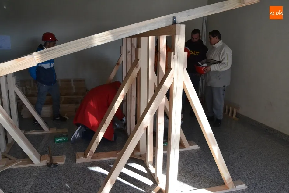 Un rincón del Pabellón Eladio Jiménez habitualmente sin uso (la sala de ping-pong) está acogiendo durante este último fin de semana del 2018 el novedoso Taller de Montaje de Tablaos Tradicionales promovido por las delegaciones de Festejos e Instalaciones del Ayuntamiento mirobrigense con el objetivo de que nuevas personas se formen en cómo se montan unos de los santos y señas del Carnaval del Toro.