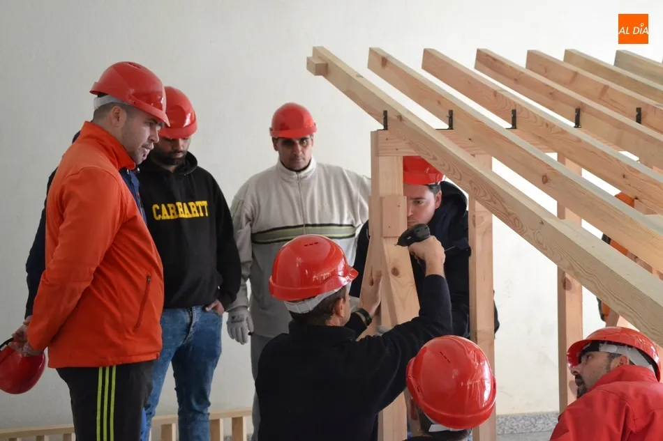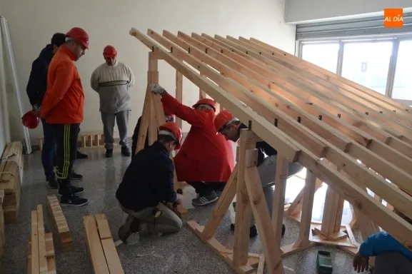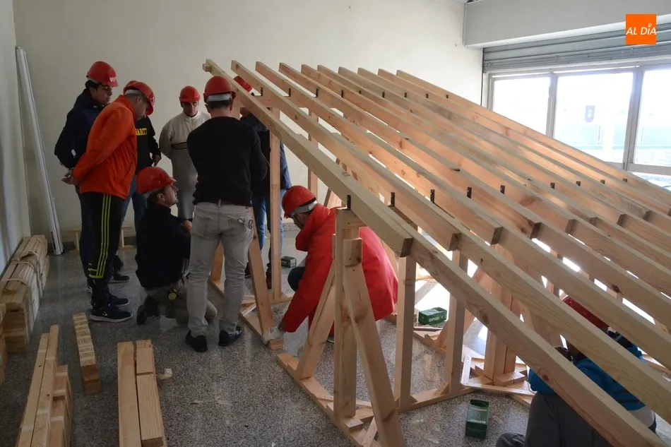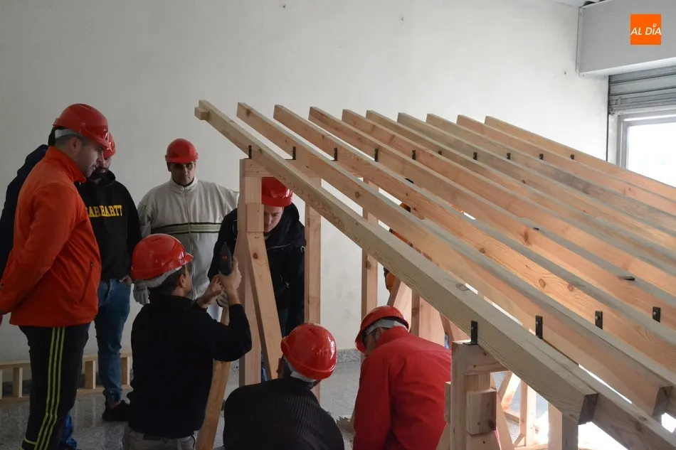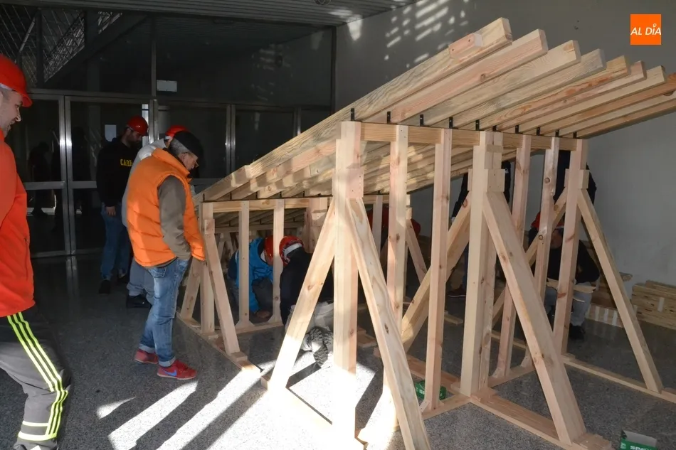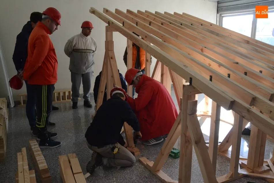 Un rincón del Pabellón Eladio Jiménez habitualmente sin uso (la sala de ping-pong) está acogiendo durante este último fin de semana del 2018 el novedoso Taller de Montaje de Tablaos Tradicionales promovido por las delegaciones de Festejos e Instalaciones del Ayuntamiento mirobrigense con el objetivo de que nuevas personas se formen en cómo se montan unos de los santos y señas del Carnaval del Toro.