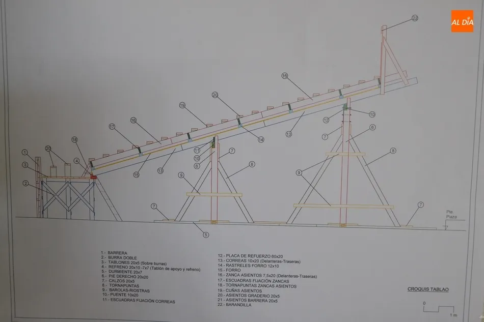 El plato principal de este taller es el montaje de la reproducción, con barreras incluidas, de uno de los tablaos de la Plaza, concretamente, de uno de los de gran tamaño que conforman la parte sur del coso. La maqueta ?que alcanza los 2 metros de altura-, ha sido creada por el carpintero municipal, Simón Moreiro, quién llevó todas las piezas hasta el Pabellón Eladio Jiménez para ahora entre todos volver a reconstruirlo.