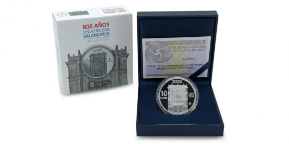 La imagen de la USAL ha viajado este 2018 en los más diversos soportes. Empezamos por la moneda de colección ?800 Años de la Universidad de Salamanca? emitida por la Fábrica Nacional de Moneda y Timbre-Real Casa de la Moneda. Una tirada de 6.000 piezas con la fachada plateresca de la Universidad en su reverso. Incluye, además, una referencia tanto al año de nacimiento de la Universidad como al actual, en el que se celebran ocho siglos de trayectoria académica, humanística e intelectual y la leyenda ?Universidad de Salamanca?.