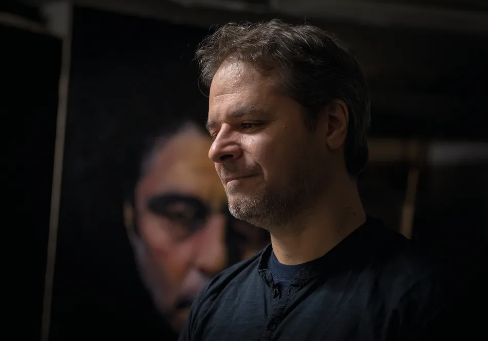 En el estudio del pintor Ángel Luis Iglesias nos golpean los rostros. Nos observan los ojos penetrantes de Benicio del Toro junto a una paleta de pintor hecha de negros y marrones, pinceles y palos de madera. Pincelada intensa, generosa de pintura, y a su lado, blanco y negro, las arrugas de Clint Eastwood nos sumergen en el mundo que es el rostro humano, infinito mapa de sugerencias. Infinita grandeza en los detalles, manos de un artista en un estudio con hechuras de taller.