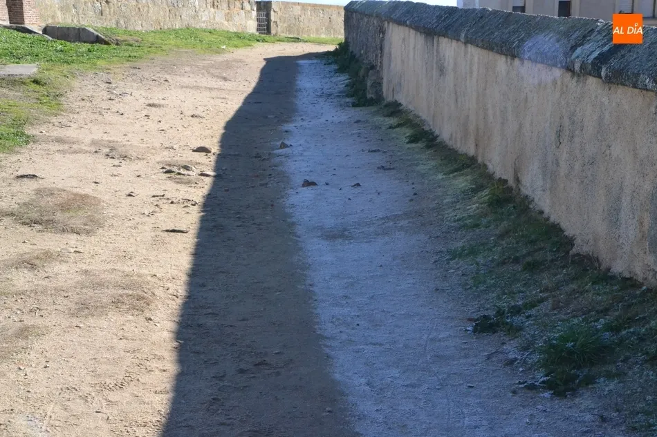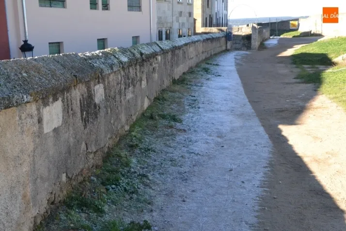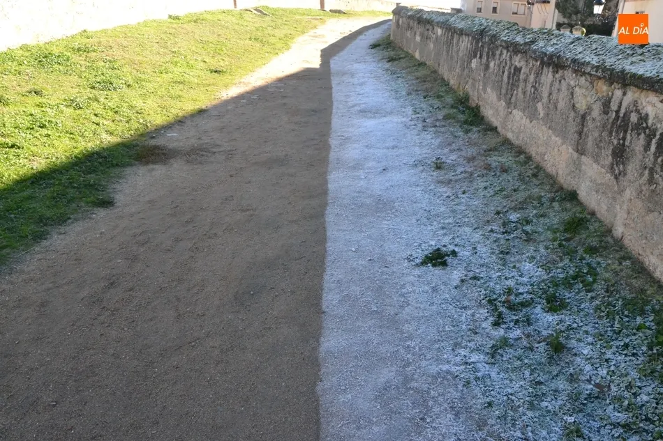 Estas heladas están dejando estampas ?curiosas?, como la que se podía ver en la mañana del miércoles en el tramo del adarve de la muralla que arranca desde el Registro en dirección al Hospital de la Pasión. Como se puede ver en las imágenes, es como si la helada hubiera cogido escuadra y cartabón para dejar perfectamente resaltada la zona afectada (teñida de blanco) respecto al resto.