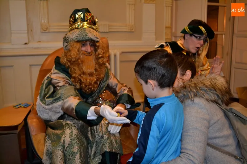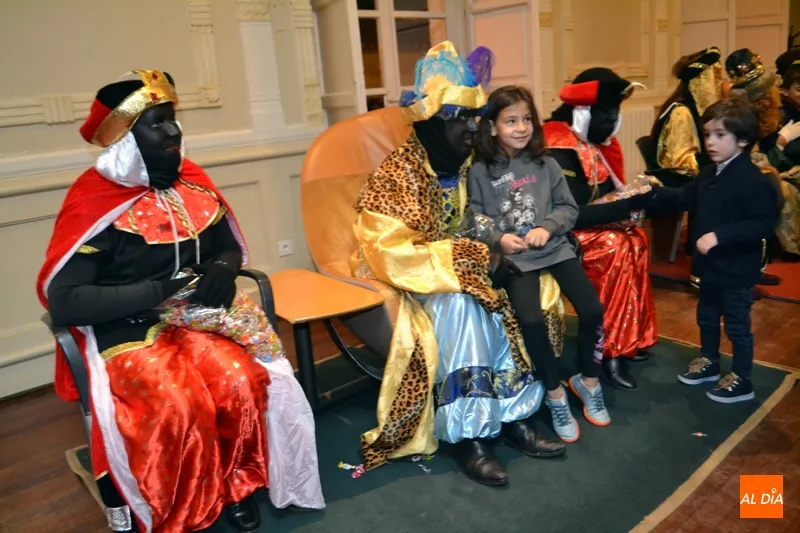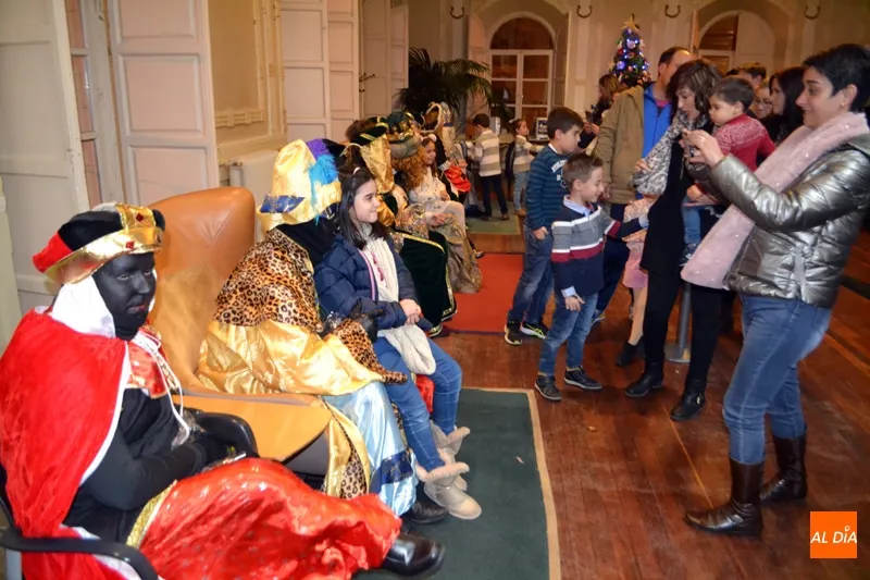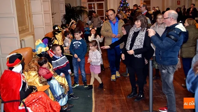 ban a formarse colas para coger sitio y participar en la recepción oficial que, pasadas las siete y media de la tarde, empezaba a desarrollarse y en la que los niños y niñas de la ciudad pudieron explicar a los Reyes las peticiones incluidas en la carta de este año, además de mostrarles su buen comportamiento durante el año.