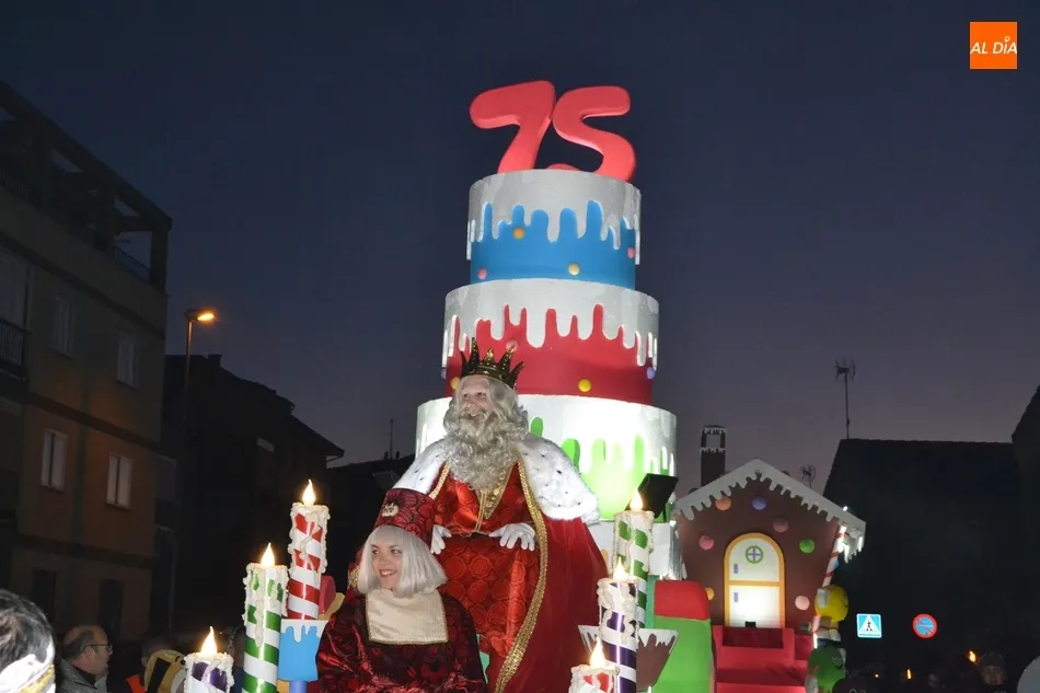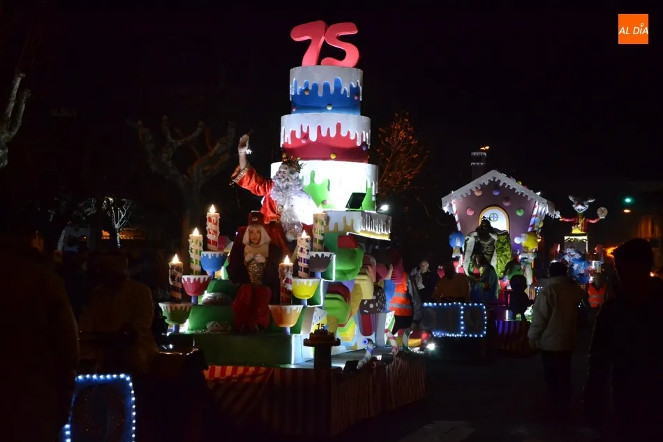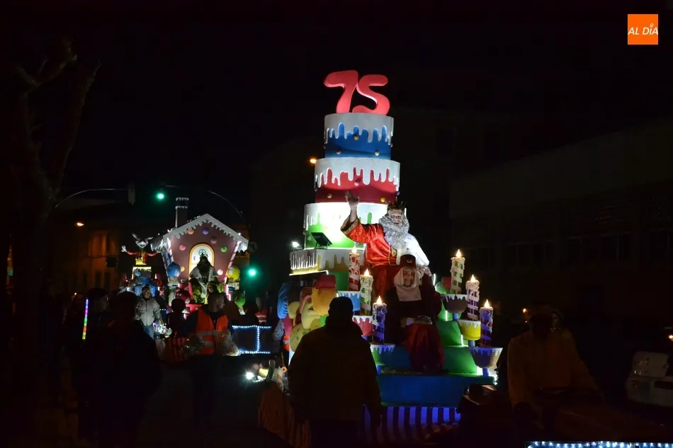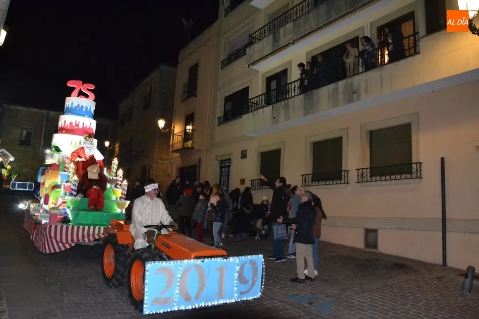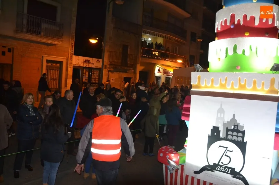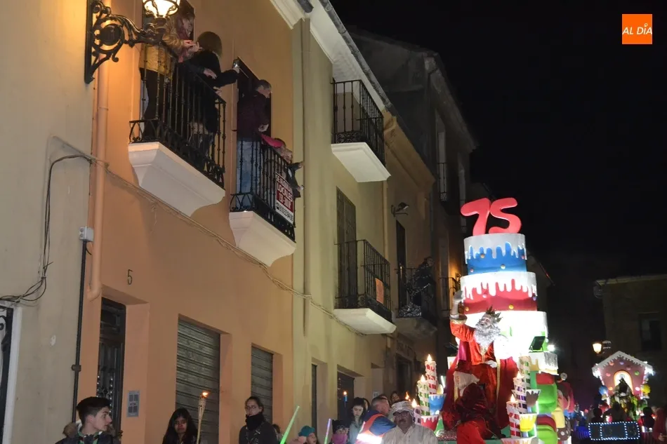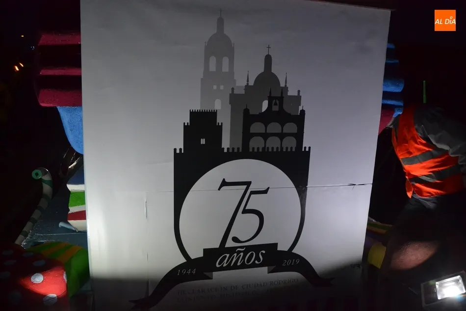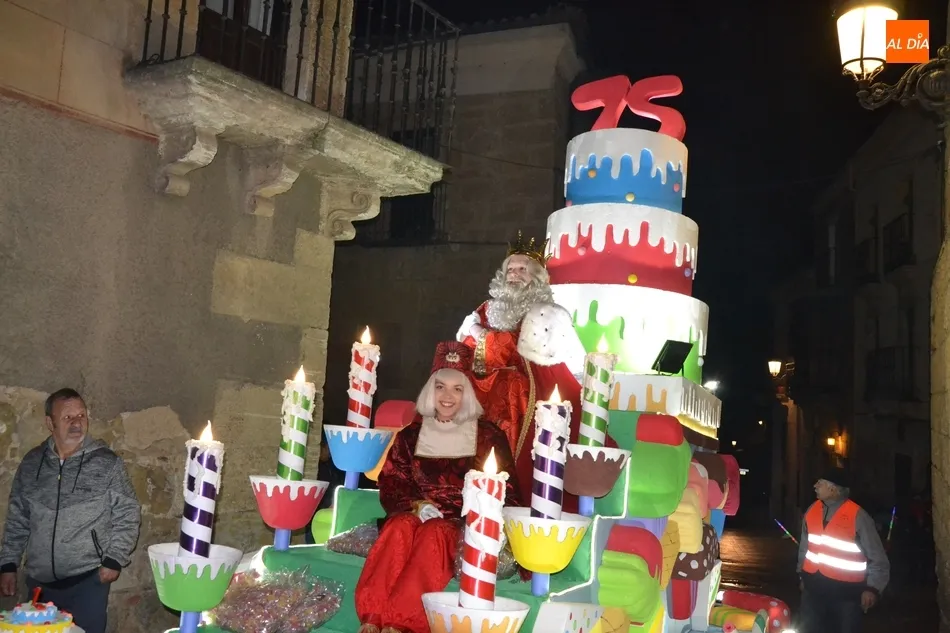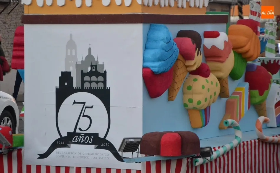 Este año, las carrozas han tenido un toque muy dulce. En el caso de Melchor, su carroza era una gran tarta; en el caso de Gaspar, una casita de chocolate; y en el caso de Baltasar, la casita del Ratoncito Pérez, estando repleta de dientes sonrientes. Las tres carrozas tenían este año un elemento común: una lona en su parte posterior en la que aparecía el logo del 75º Aniversario de la Declaración de Ciudad Rodrigo como Conjunto Histórico-Artístico. Los Reyes Magos se sumaron a este cumpleaños con otro detalle más: un ?75? encima de la tarta de la carroza de Melchor.