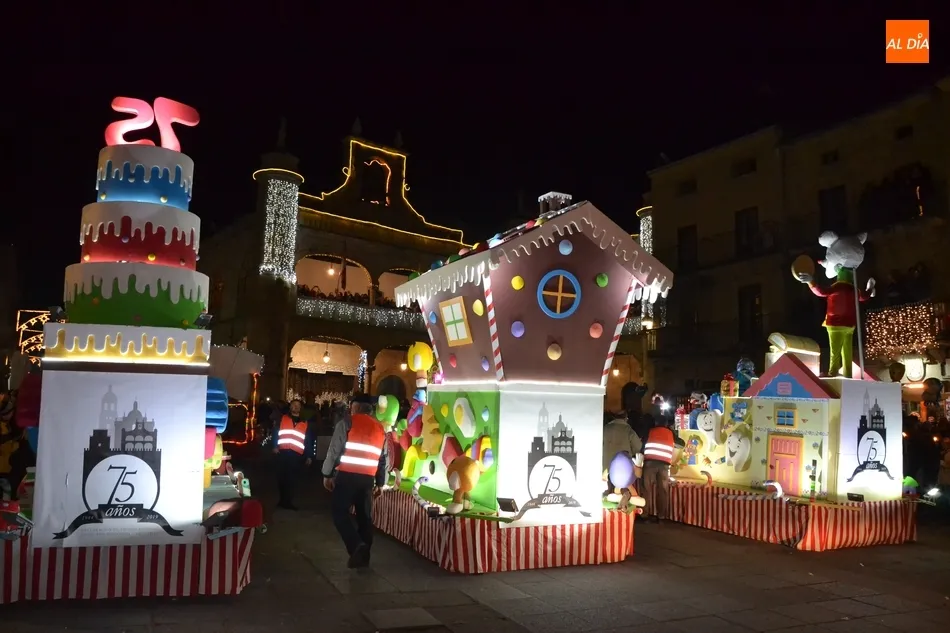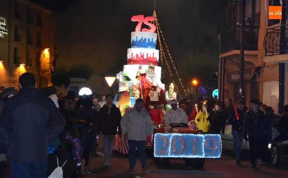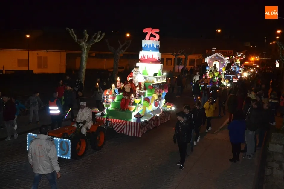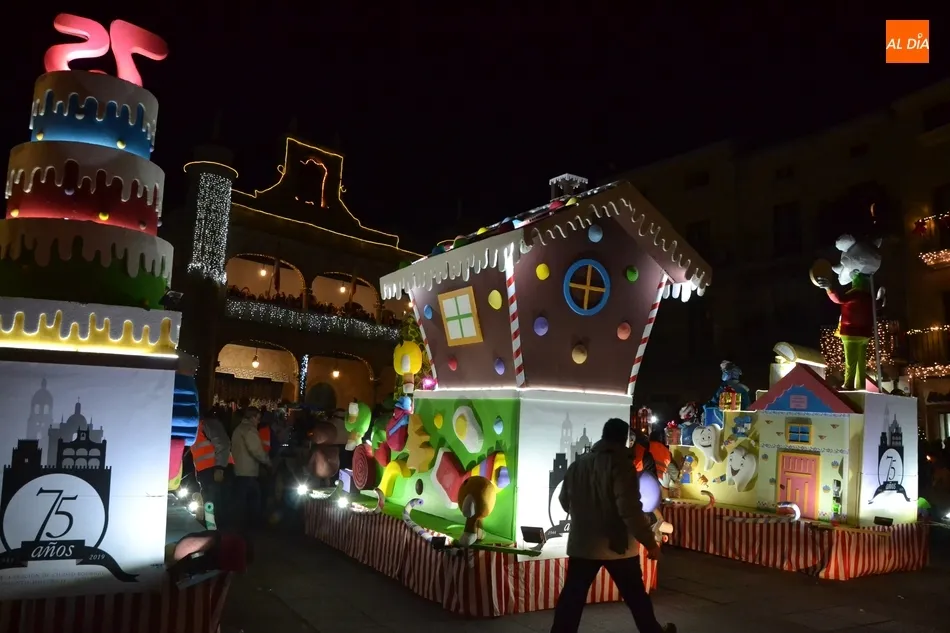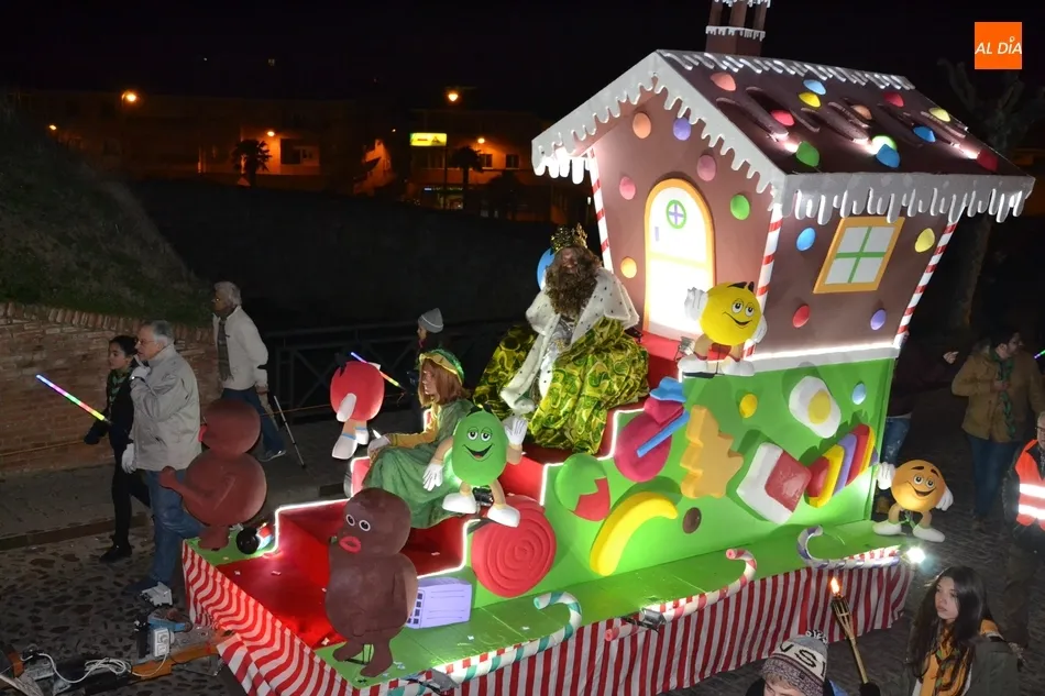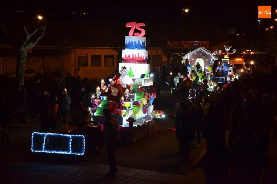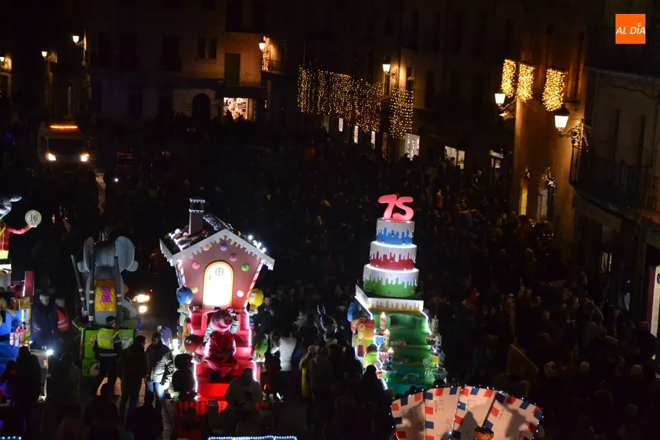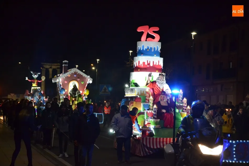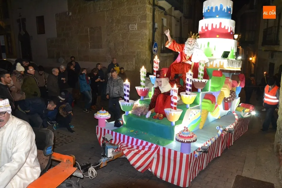 Este año, las carrozas han tenido un toque muy dulce. En el caso de Melchor, su carroza era una gran tarta; en el caso de Gaspar, una casita de chocolate; y en el caso de Baltasar, la casita del Ratoncito Pérez, estando repleta de dientes sonrientes. Las tres carrozas tenían este año un elemento común: una lona en su parte posterior en la que aparecía el logo del 75º Aniversario de la Declaración de Ciudad Rodrigo como Conjunto Histórico-Artístico. Los Reyes Magos se sumaron a este cumpleaños con otro detalle más: un ?75? encima de la tarta de la carroza de Melchor.