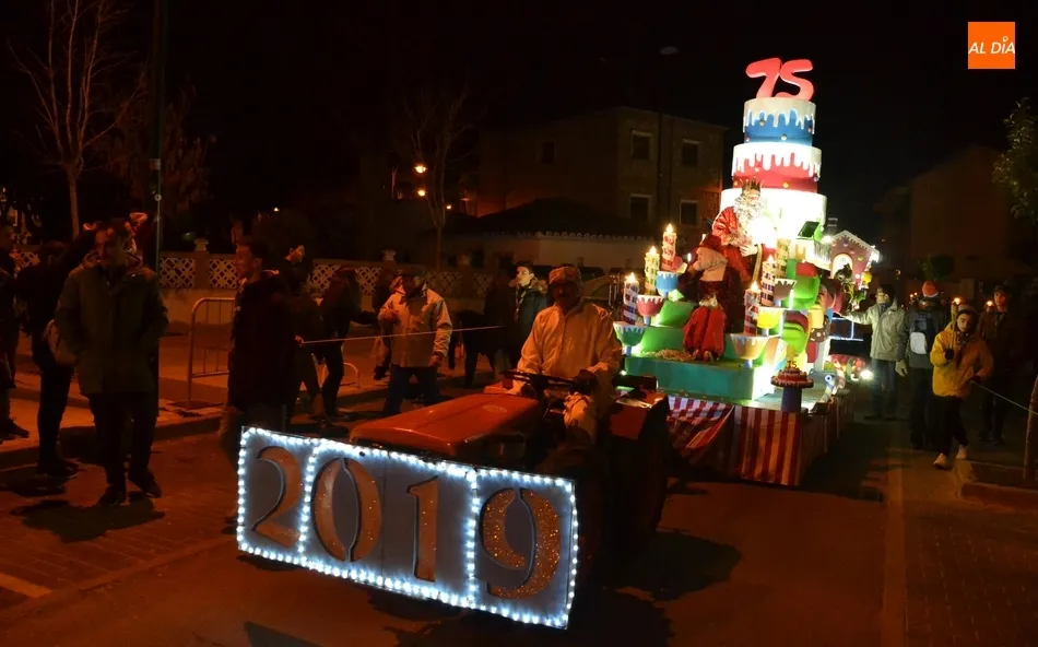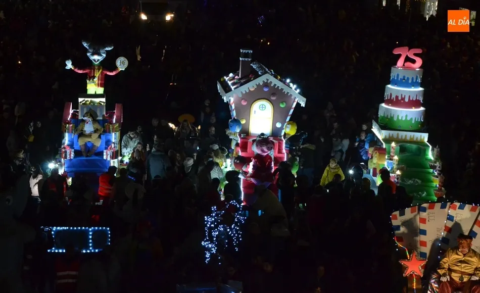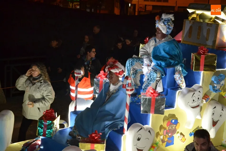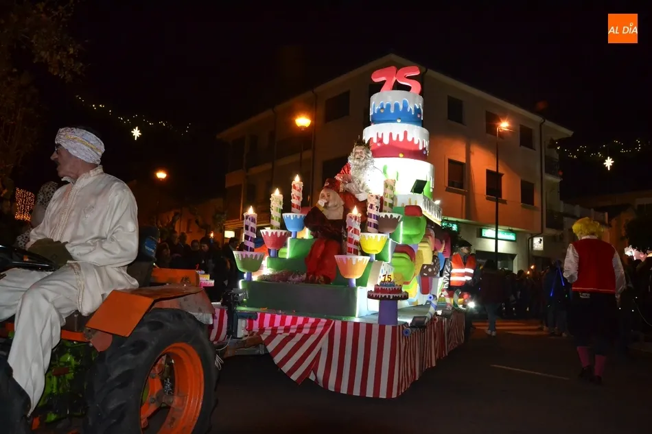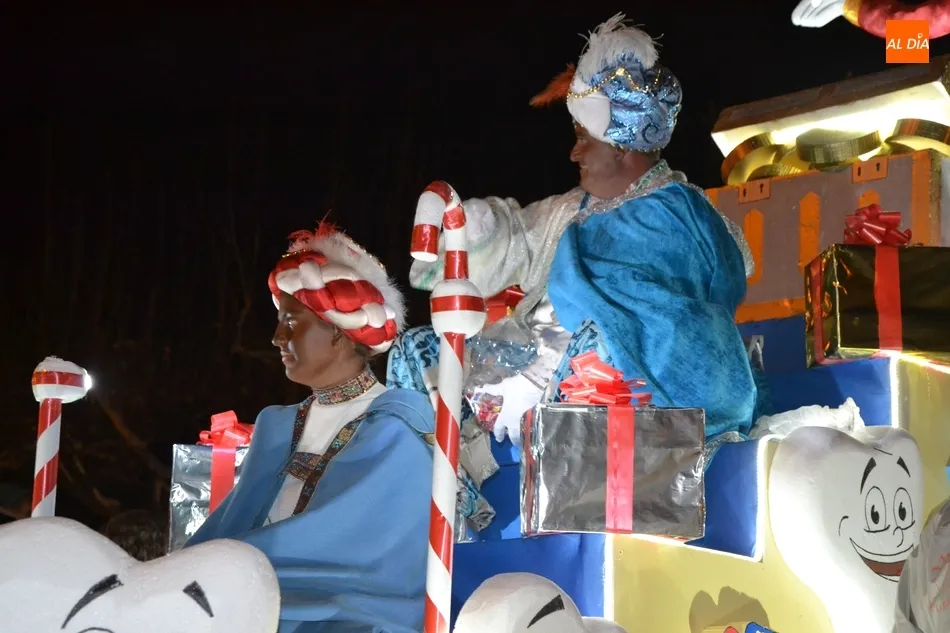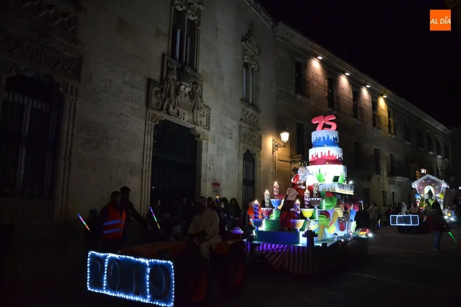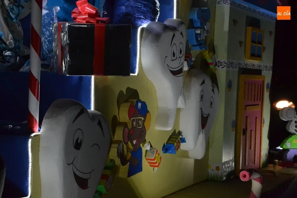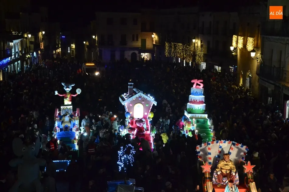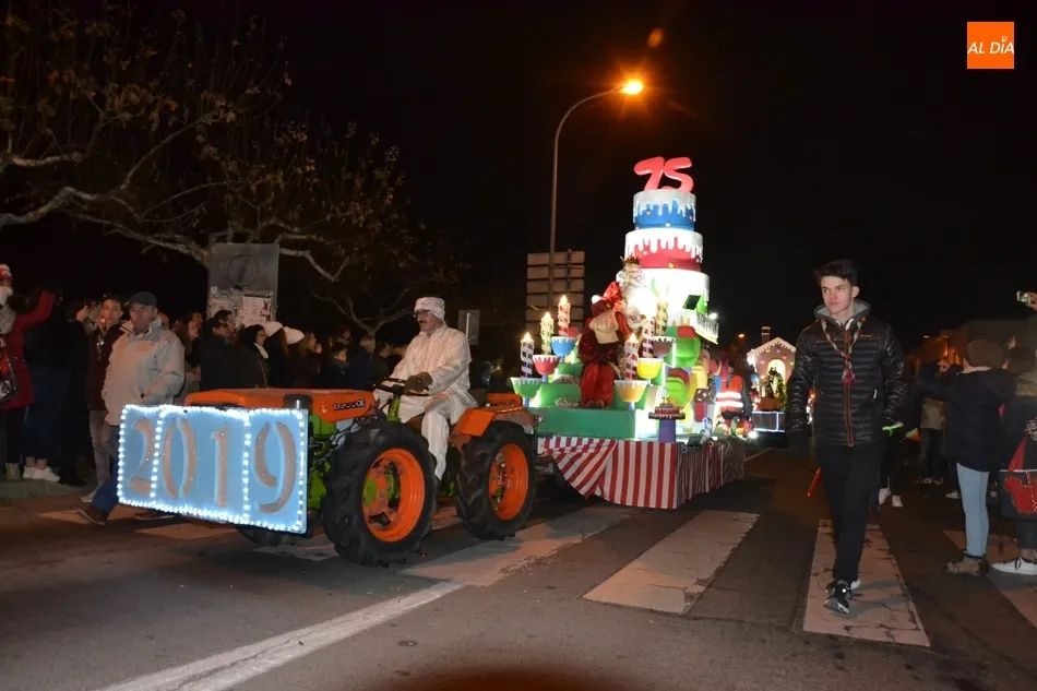 Este año, las carrozas han tenido un toque muy dulce. En el caso de Melchor, su carroza era una gran tarta; en el caso de Gaspar, una casita de chocolate; y en el caso de Baltasar, la casita del Ratoncito Pérez, estando repleta de dientes sonrientes. Las tres carrozas tenían este año un elemento común: una lona en su parte posterior en la que aparecía el logo del 75º Aniversario de la Declaración de Ciudad Rodrigo como Conjunto Histórico-Artístico. Los Reyes Magos se sumaron a este cumpleaños con otro detalle más: un ?75? encima de la tarta de la carroza de Melchor.