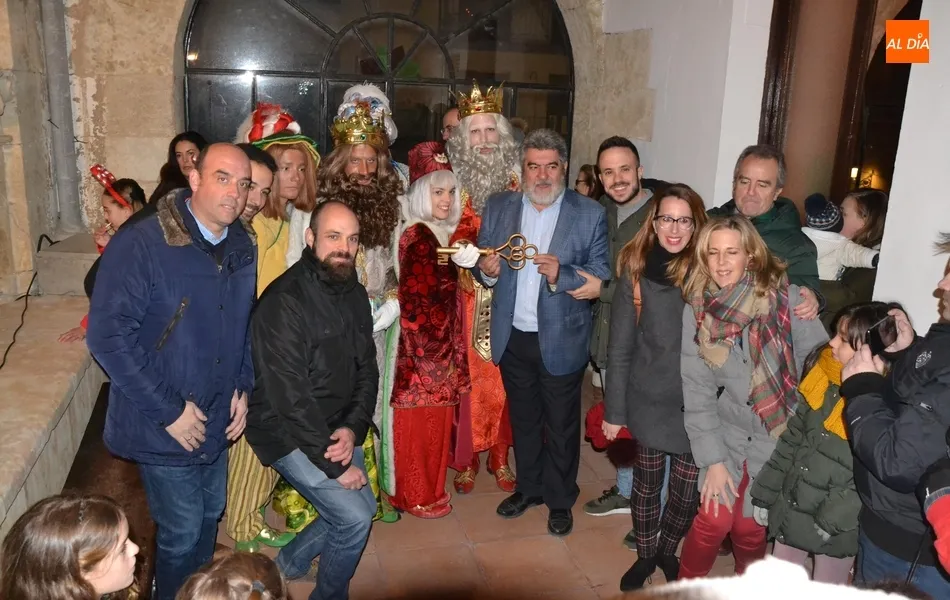 Una vez los Magos detuvieron sus carrozas, subieron a la balconada de la Casa Consistorial para dirigir un mensaje a todos los niños congregados en el ágora y para recibir la llave mágica de manos del alcalde Juan Tomás Muñoz. En esos momentos, en la Plaza hacía 6,5ºC, una temperatura fría pero mejor que la de los dos días anteriores.