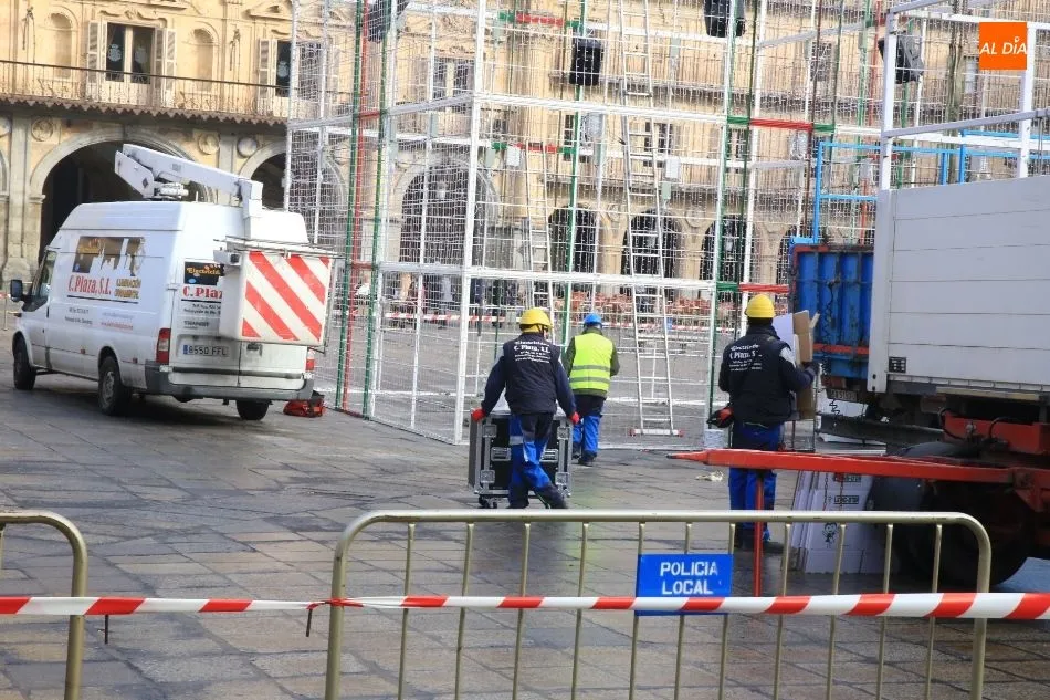 Este martes la ciudad de Salamanca volvía a la normalidad, tras las fiestas navideñas. Prueba de ello fue el desmontaje de la gran estructura luminosa que ha ocupado durante varias semanas el centro de la Plaza Mayor.